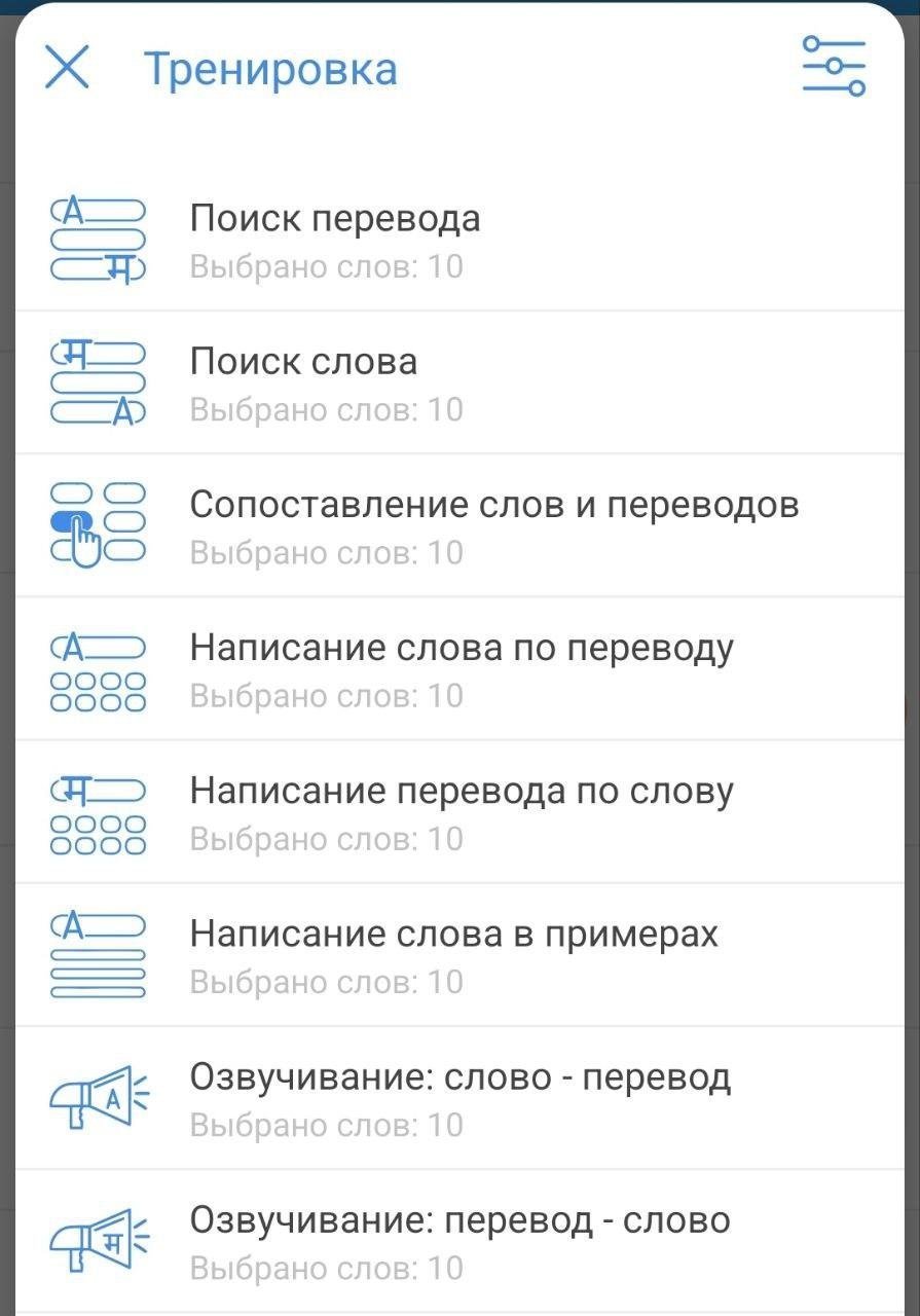 - Тогда я отправилась на поиски приложения, которое само бы добавляло перевод. Не исключаю, что сейчас эта фича может быть много где, я не проверяла. Вероятно, я опробовала прилично приложений, уже и не вспомню, и покрыла все самое популярное, потому что в итоге остановилась на том, чем пользуюсь и по сей день и о чем слышало существенно меньше людей - Мой словарь. Количество скачиваний у него раз в 100 меньше, чем у Анки или Квизлета. У этого приложения также есть тренировки для заучивания слов, которыми я пользуюсь. Так как я за простые и минимальные механики, это либо “Сопоставление слов и переводов” (третье фото), либо “Поиск перевода” (четвертое фото)