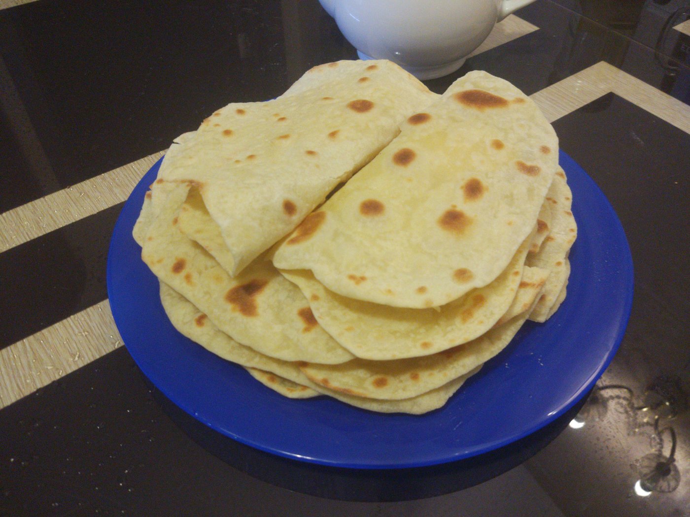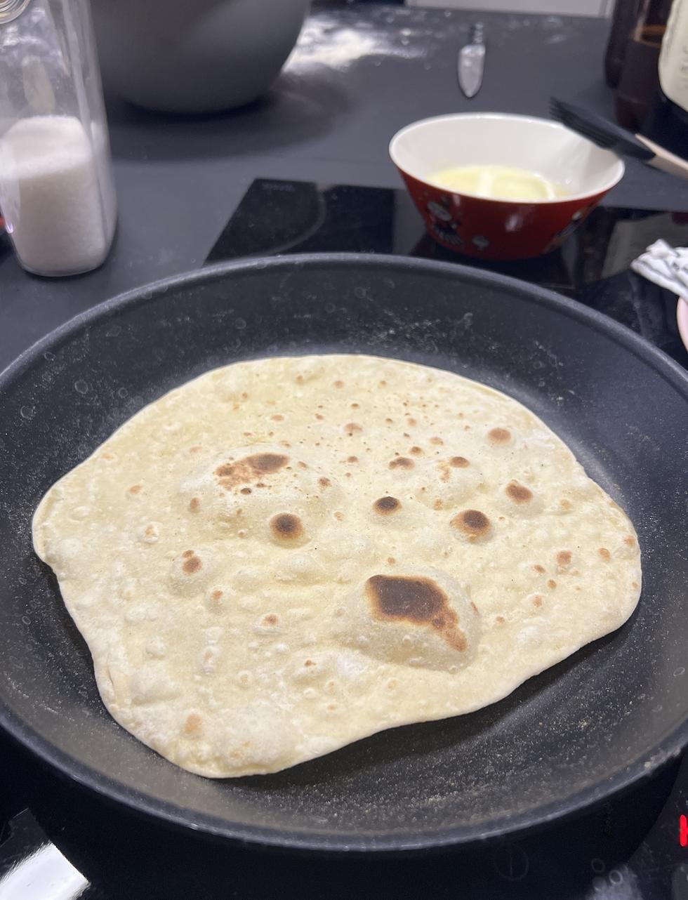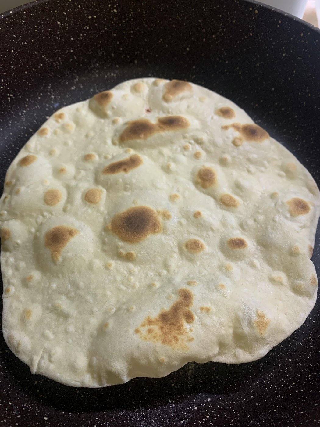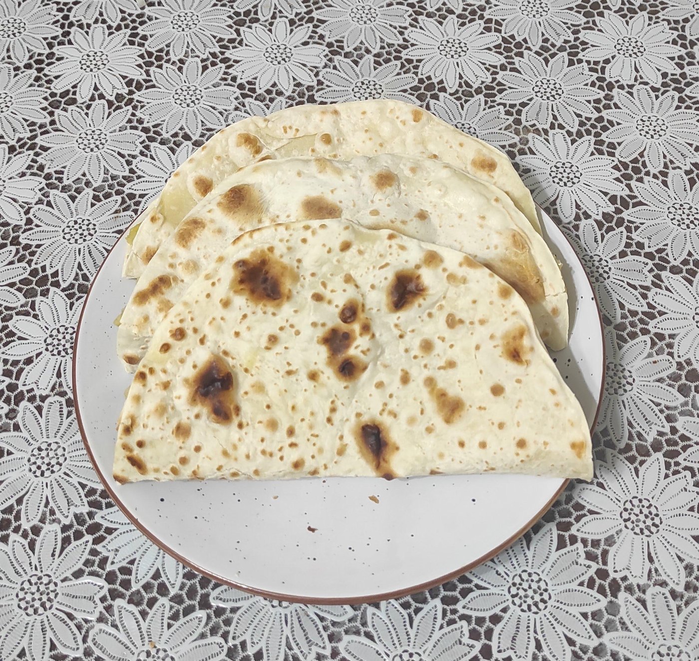 Круг сразу отправляется на сухую и горячую сковороду. Как только появлятся темные пятна (см фото), переворачиваем. Снимаем со скороводы готовую лепешку, складываем в стопочку на тарелку. Очень важно: накройте стопку полотенцем, чтобы лепешки в итоге были мягкие, а не хрустящие.