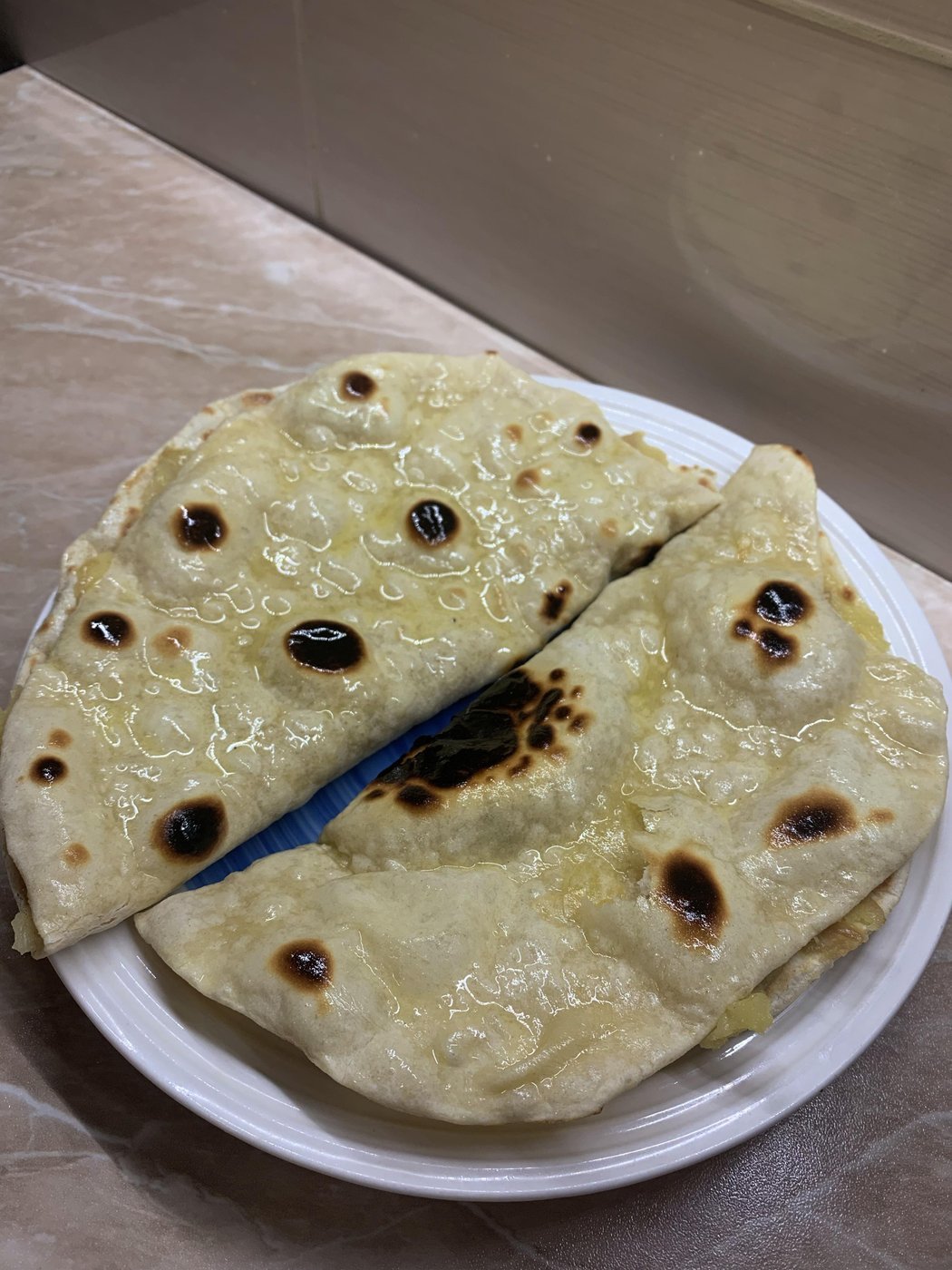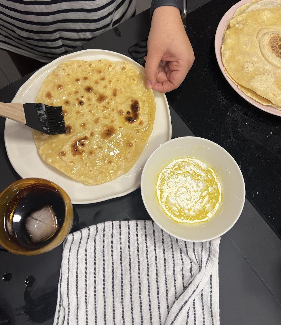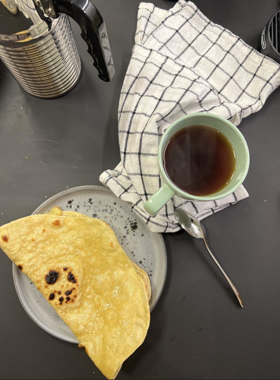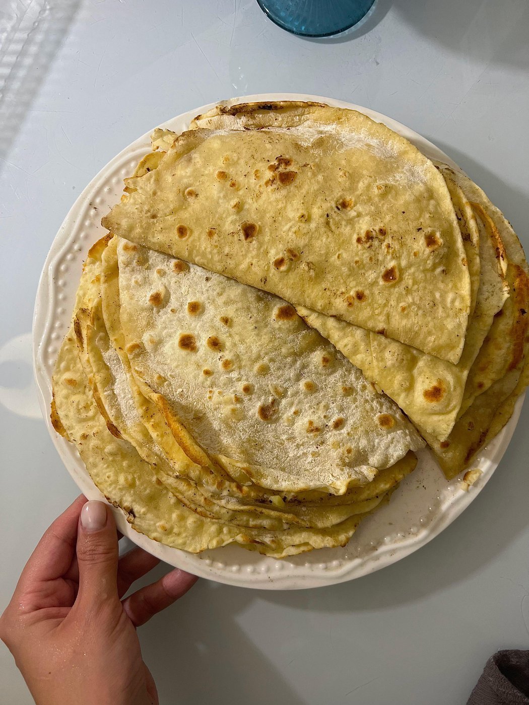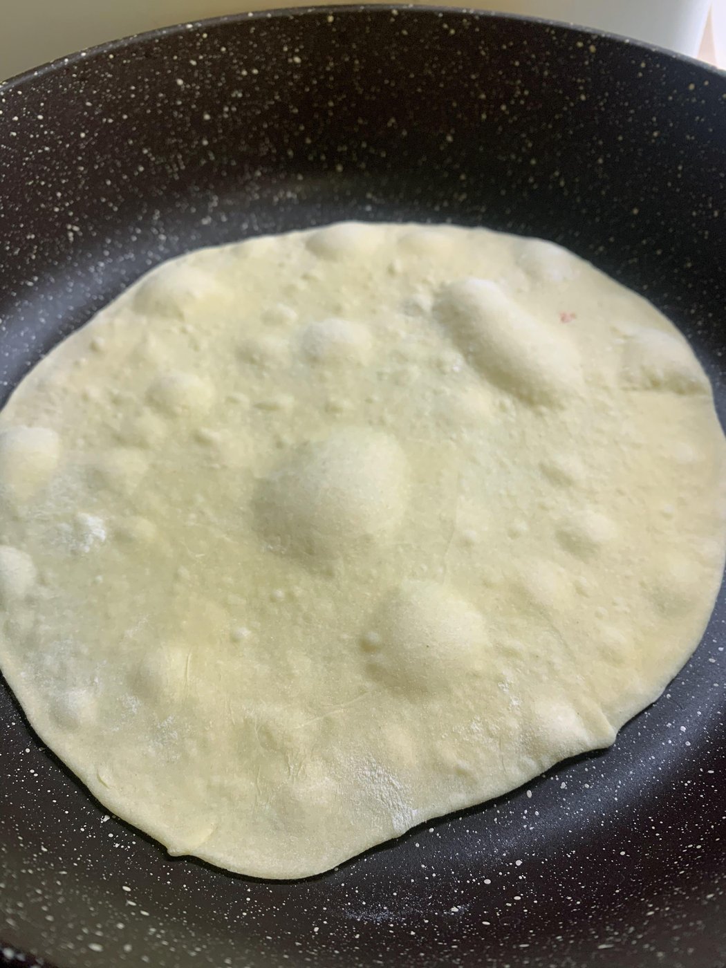 Круг сразу отправляется на сухую и горячую сковороду. Как только появлятся темные пятна (см фото), переворачиваем. Снимаем со скороводы готовую лепешку, складываем в стопочку на тарелку. Очень важно: накройте стопку полотенцем, чтобы лепешки в итоге были мягкие, а не хрустящие.