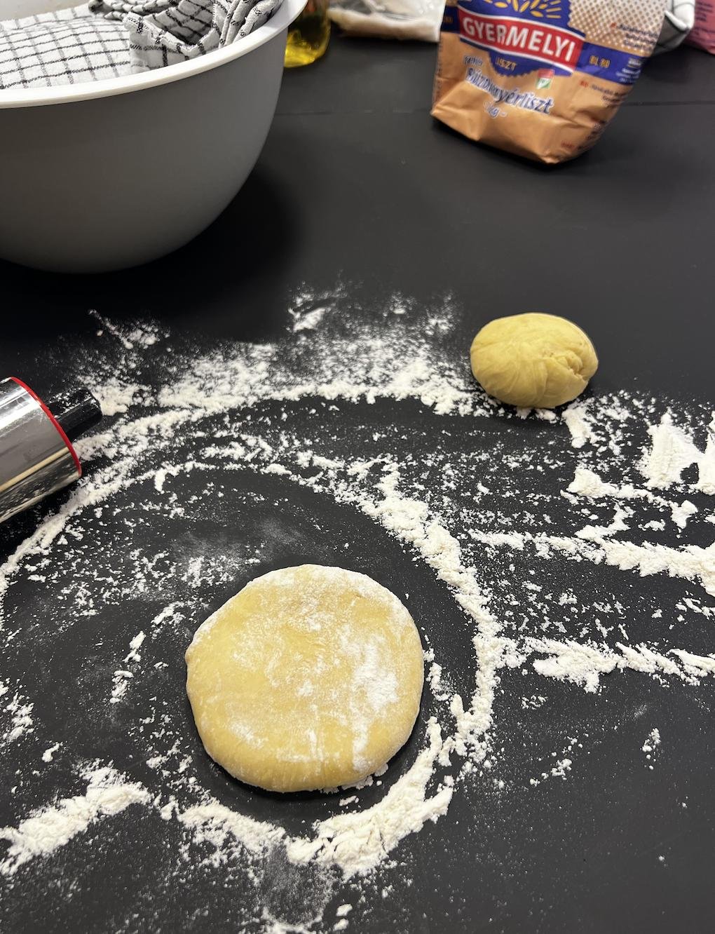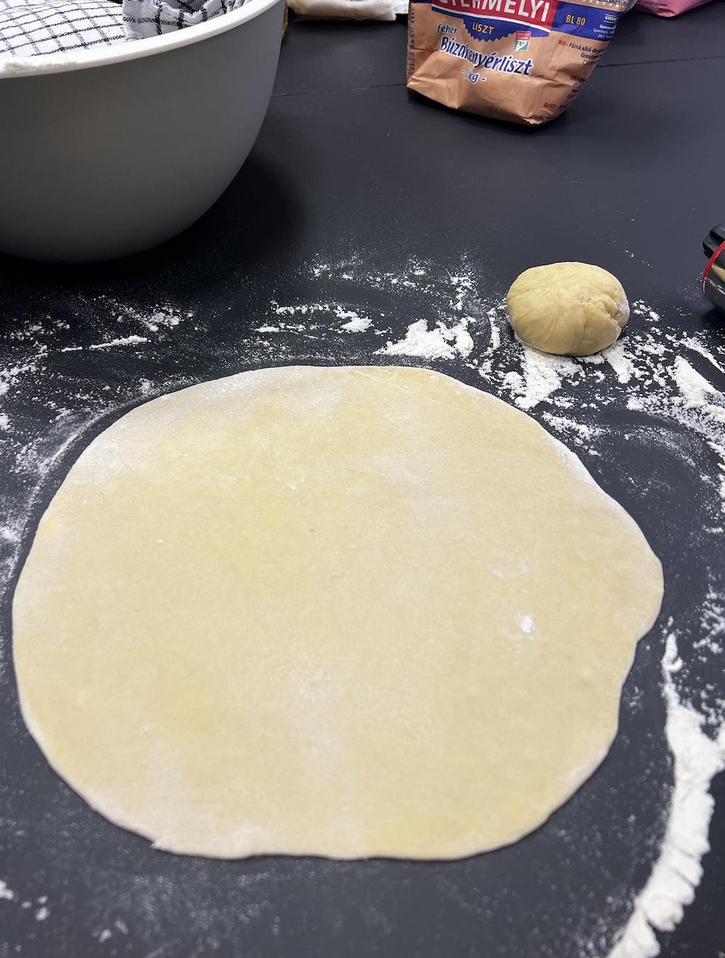 Берем кусочек постоявшего теста, разминаем в руке, формируем шарик (у нас был 75-85г) и начинаем его раскатывать, присыпая мукой. Нам нужен довольно тонкий круг, как на пельмени, буквально пару мм толщиной. Этого можно добиться, часто меняя положение тестового кружочка (вертеть его в разные стороны). Липнет? Посыпьте мукой. Если не добились формы красивого круга — не беда, накройте тарелкой и лишнее отрежьте.