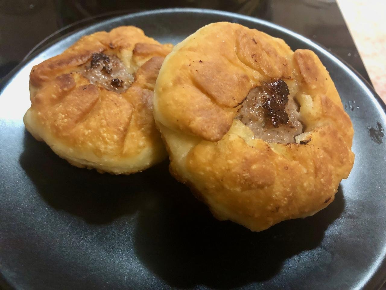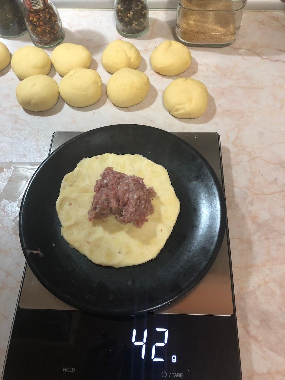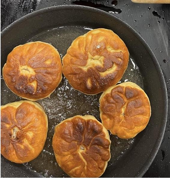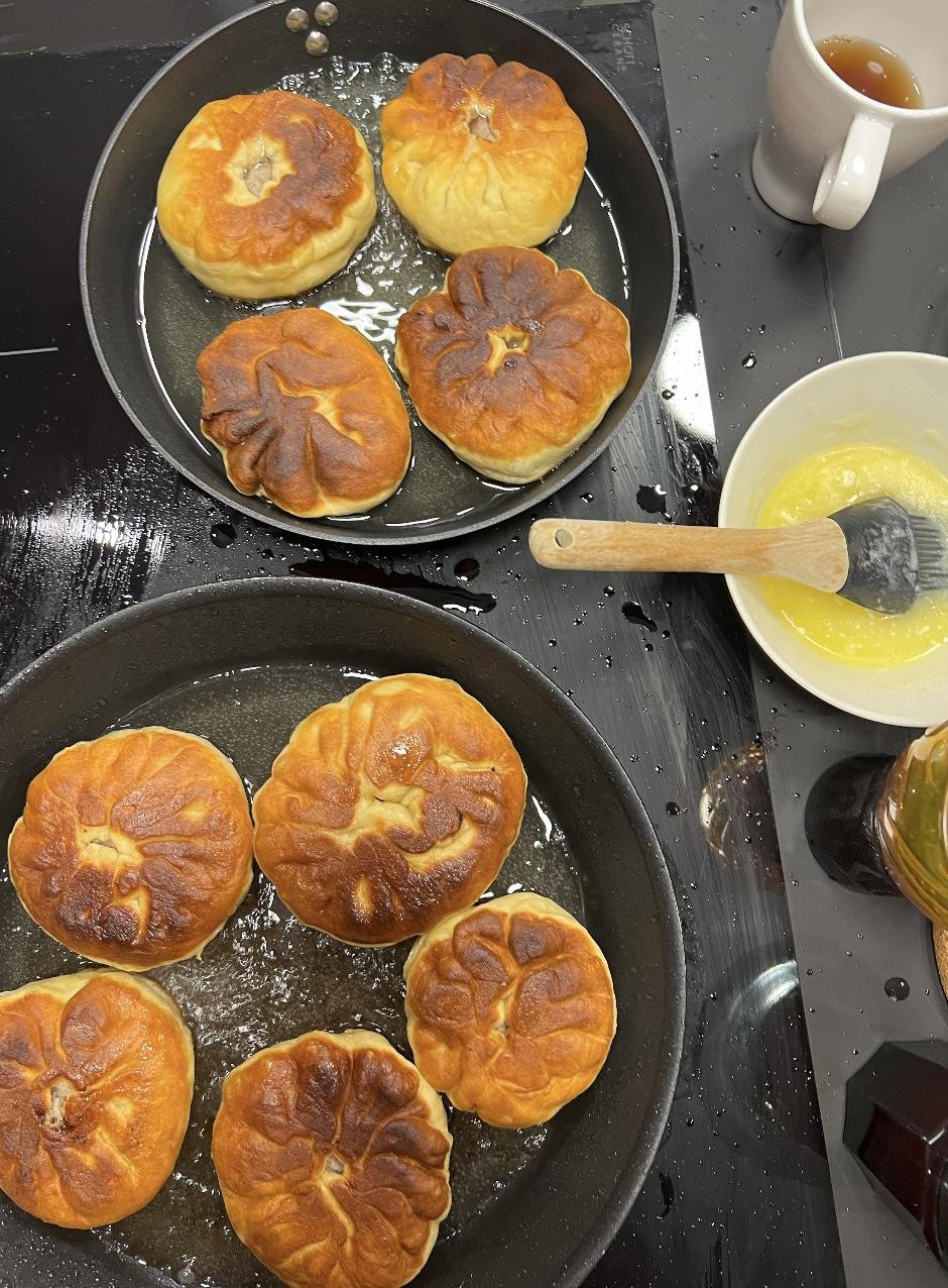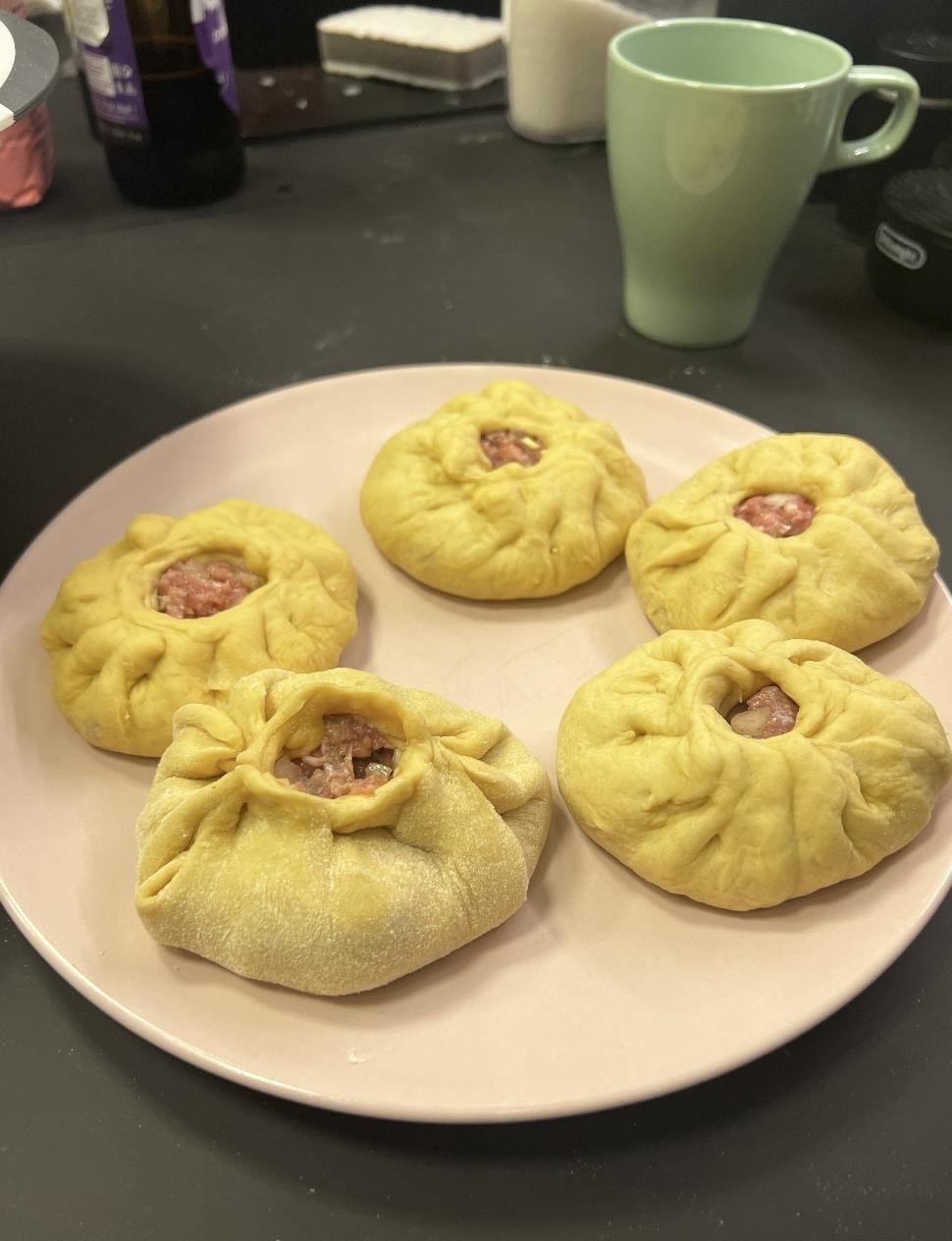 В процессе готовки поняли, что скульпторы из нас так себе, поэтому по форм-фактору получились скорее хинкали (я хз как еще заворачивать их) и один недочебурек потому что мы можем.