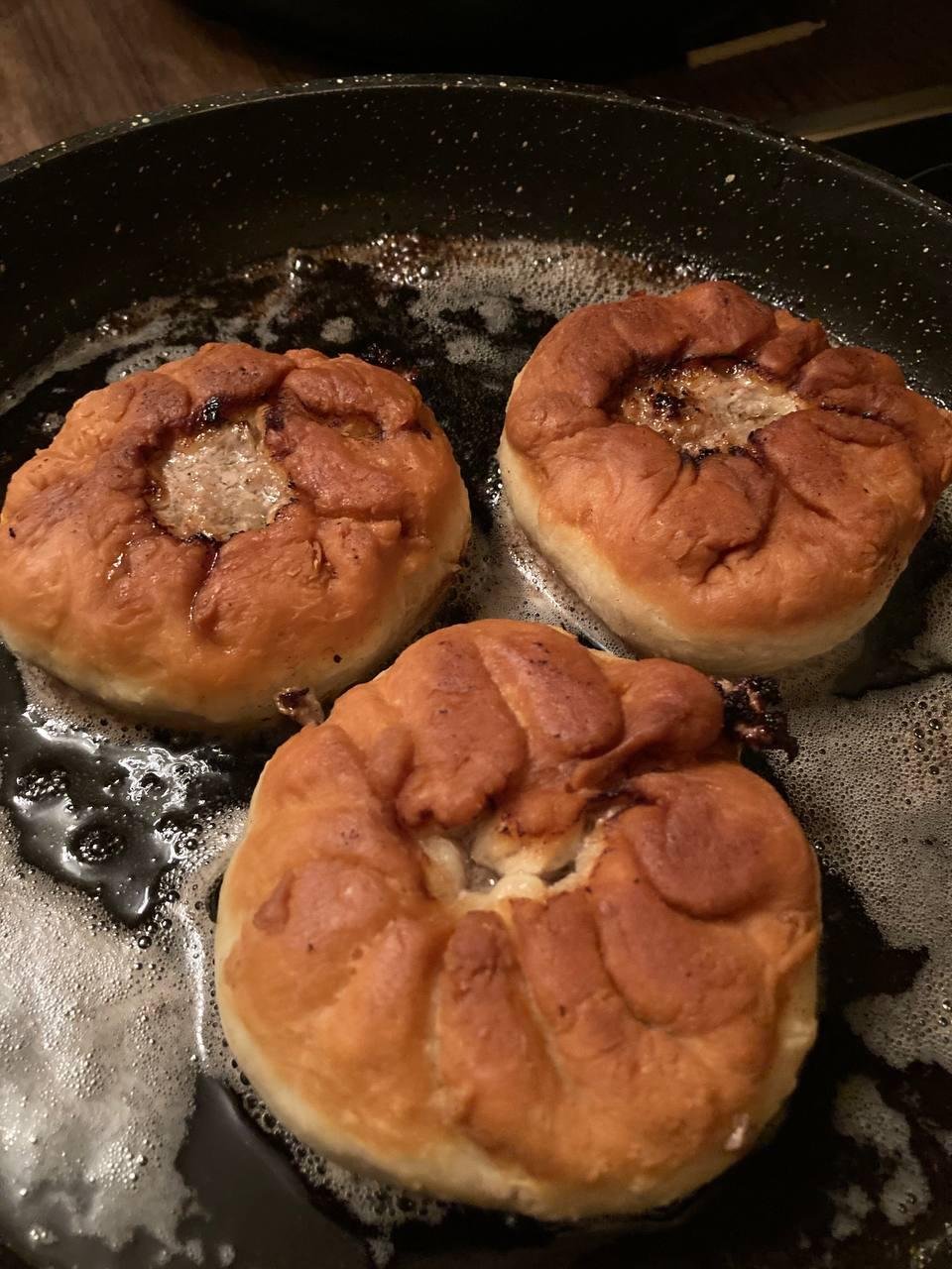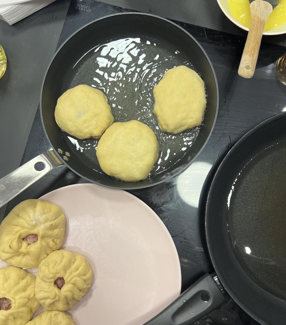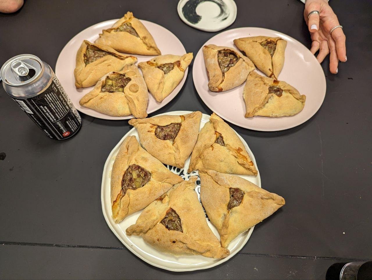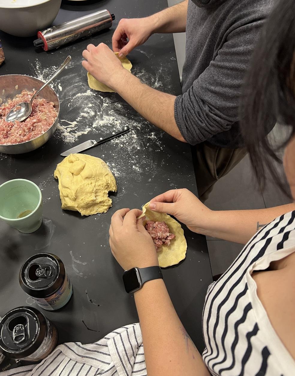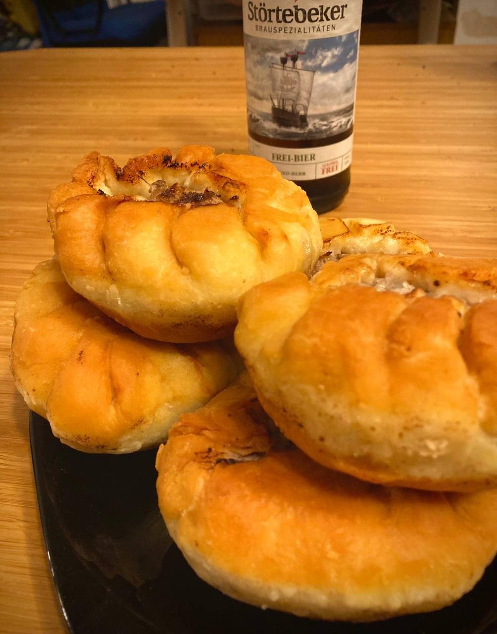 В процессе готовки поняли, что скульпторы из нас так себе, поэтому по форм-фактору получились скорее хинкали (я хз как еще заворачивать их) и один недочебурек потому что мы можем.