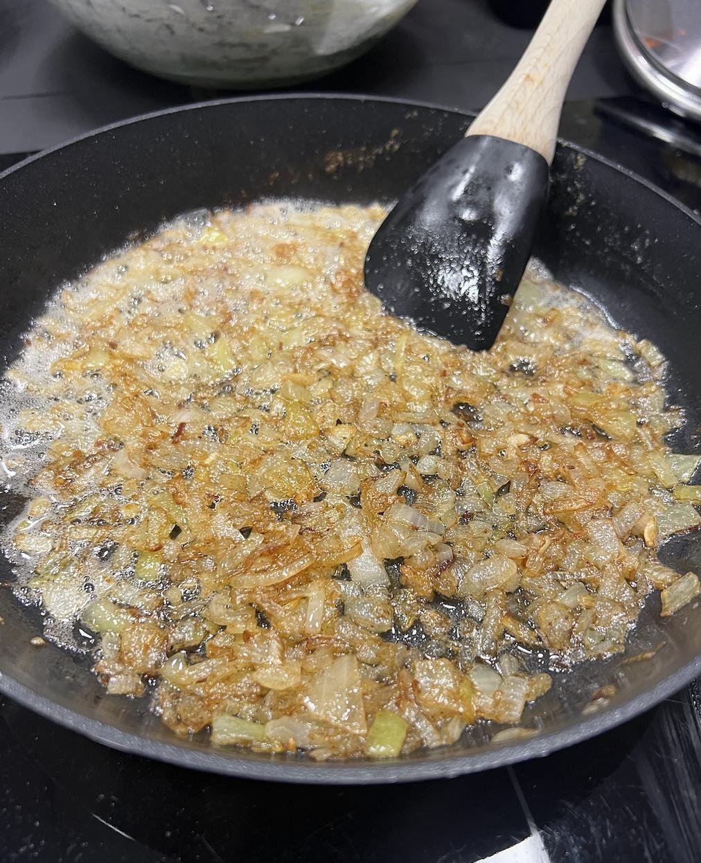 Ждем, пока сварится (минут 15). В это время чистим луковицу и режем её довольно мелко, кубиками. Но не в фарш. Растапливаем на сковороде грамм 100-150 сливочного масла (помним про совесть), жарим лук до золотистости.