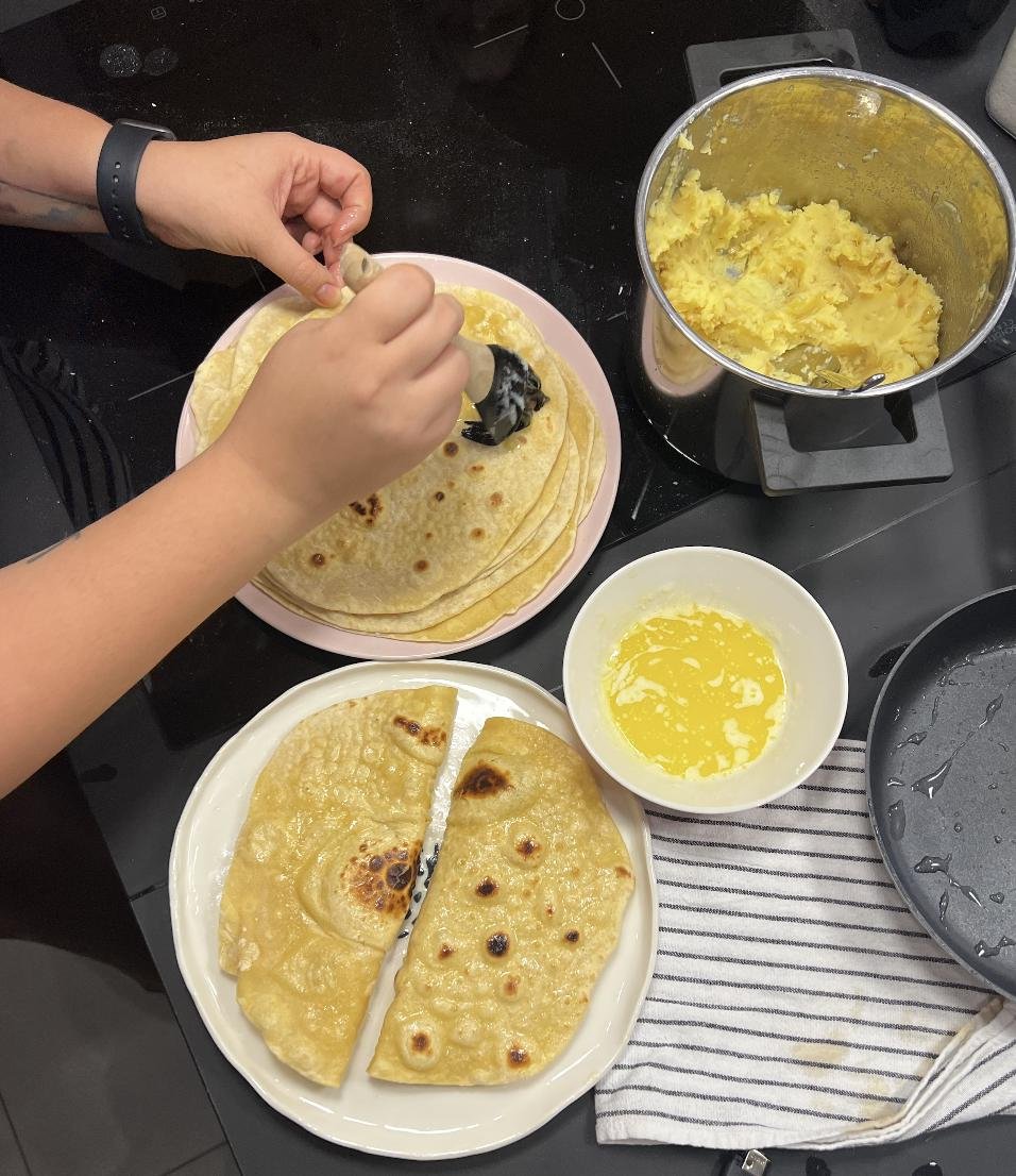 Растапливаем кусок масла, у нас ушло около 50-70 граммов. И каждую лепешку смазывам с двух сторон щедро маслом, на половину намазываем щедро пюре (1-2 см), складываем лепешку вдвое некоторые туда ещё сыра или колбасы заодно запихивают, но рекомендую начать с классики. Готовые кыстыбыи складываем в стопку, завариваем черный чай, разливаем по чашкам, добавляем сахар, и наслаждаемся. :)