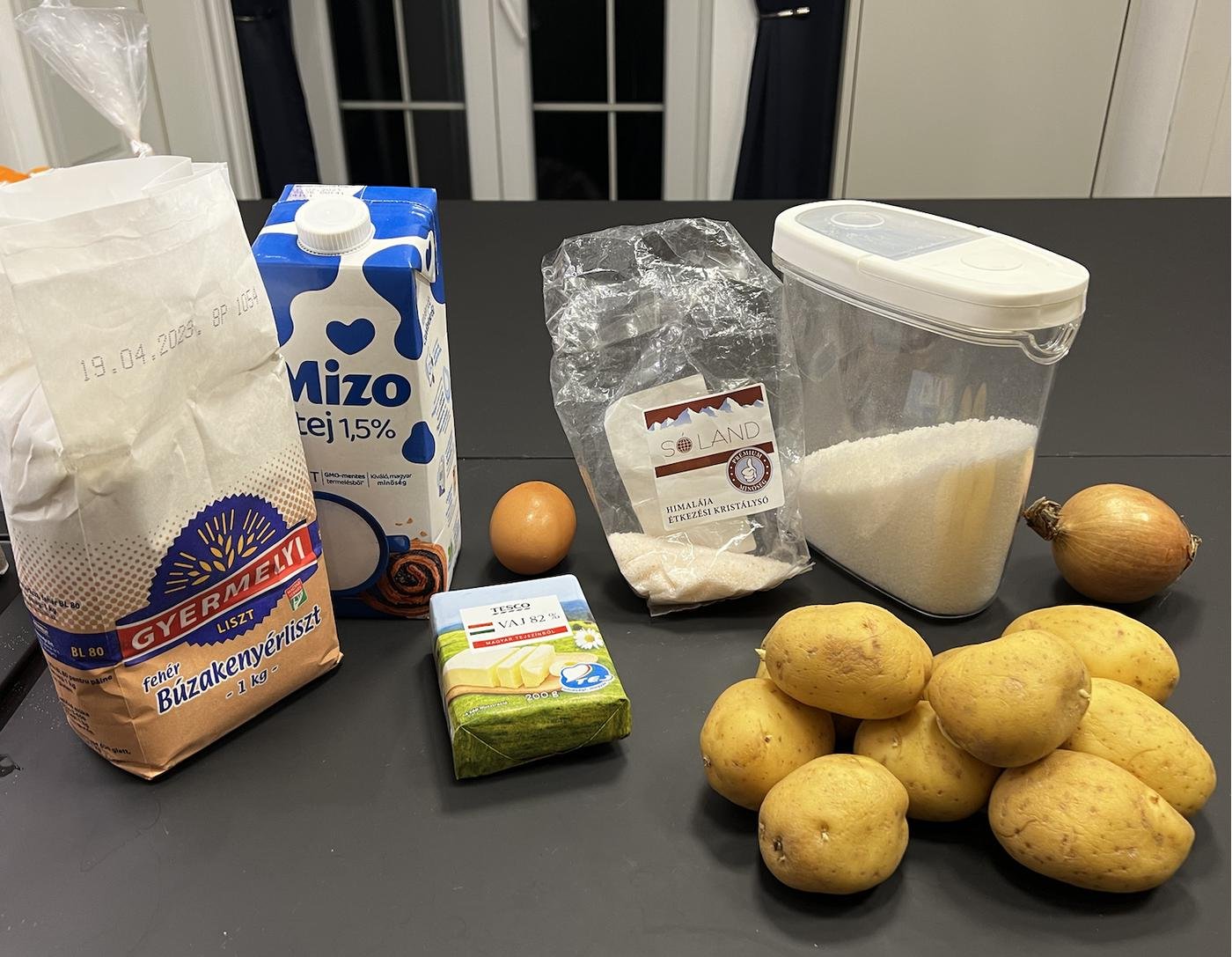 Итак, нам понадобится: 800-1000 г картофеля, 1-2 луковицы, 1 яйцо, щедрая щепотка соли, 1 столовая ложка сахара, 150 мл молока, примерно 300-450 г муки (сколько возьмет тесто), и хорошее сливочное масло, сколько позволит совесть. Минимум полпачки.