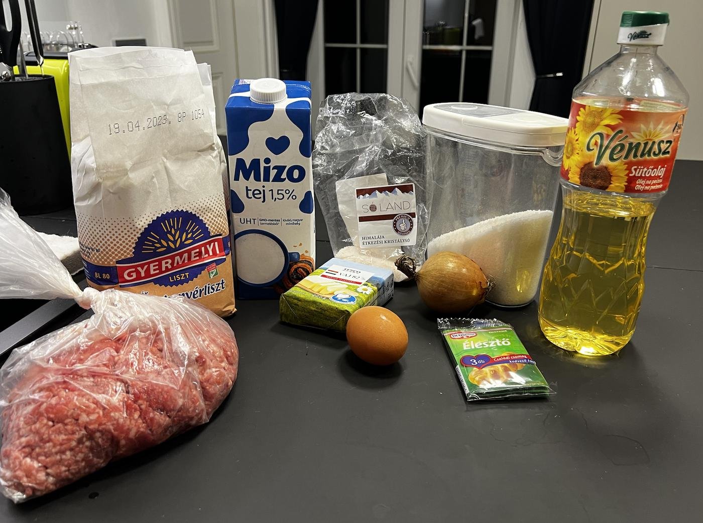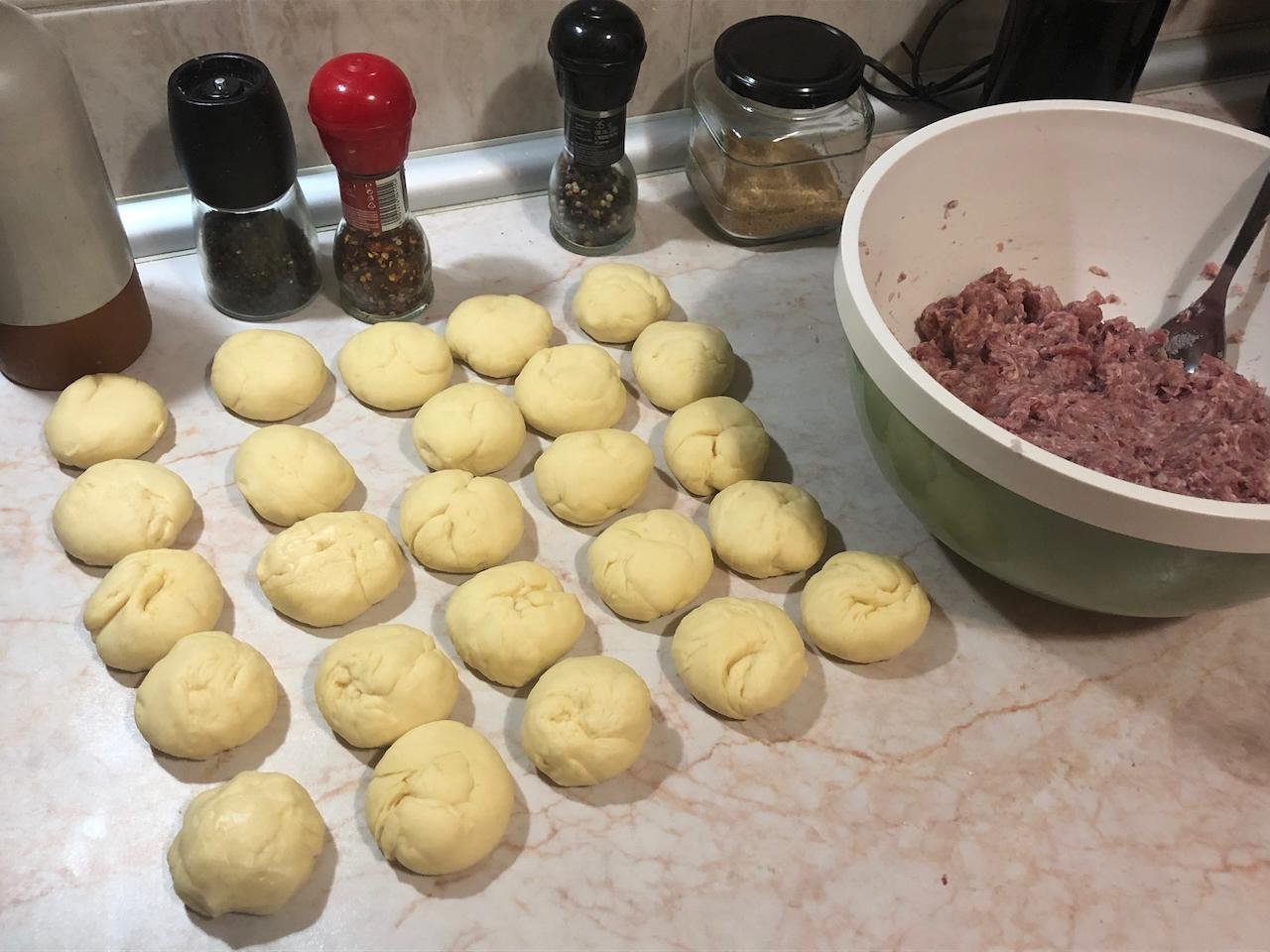 Итак, нам понадобится: 1 яйцо, очень щедрая щепотка соли, 2 ст.л растительного масла (только не оливковое-пахнущее, лучше уж сливочное), 1 столовая ложка сахара, 250 мл молока, пакетик дрожжей, примерно 450-500 г муки (сколько возьмет тесто, но оно должно быть менее крутое, чем на кыстыбыи), 500-600 г смешанного фарша (свинина-говядина, можно и баранину добавить, главное чтобы фарш не был постный и грустный), 2 луковицы, растительное масло для жарки.