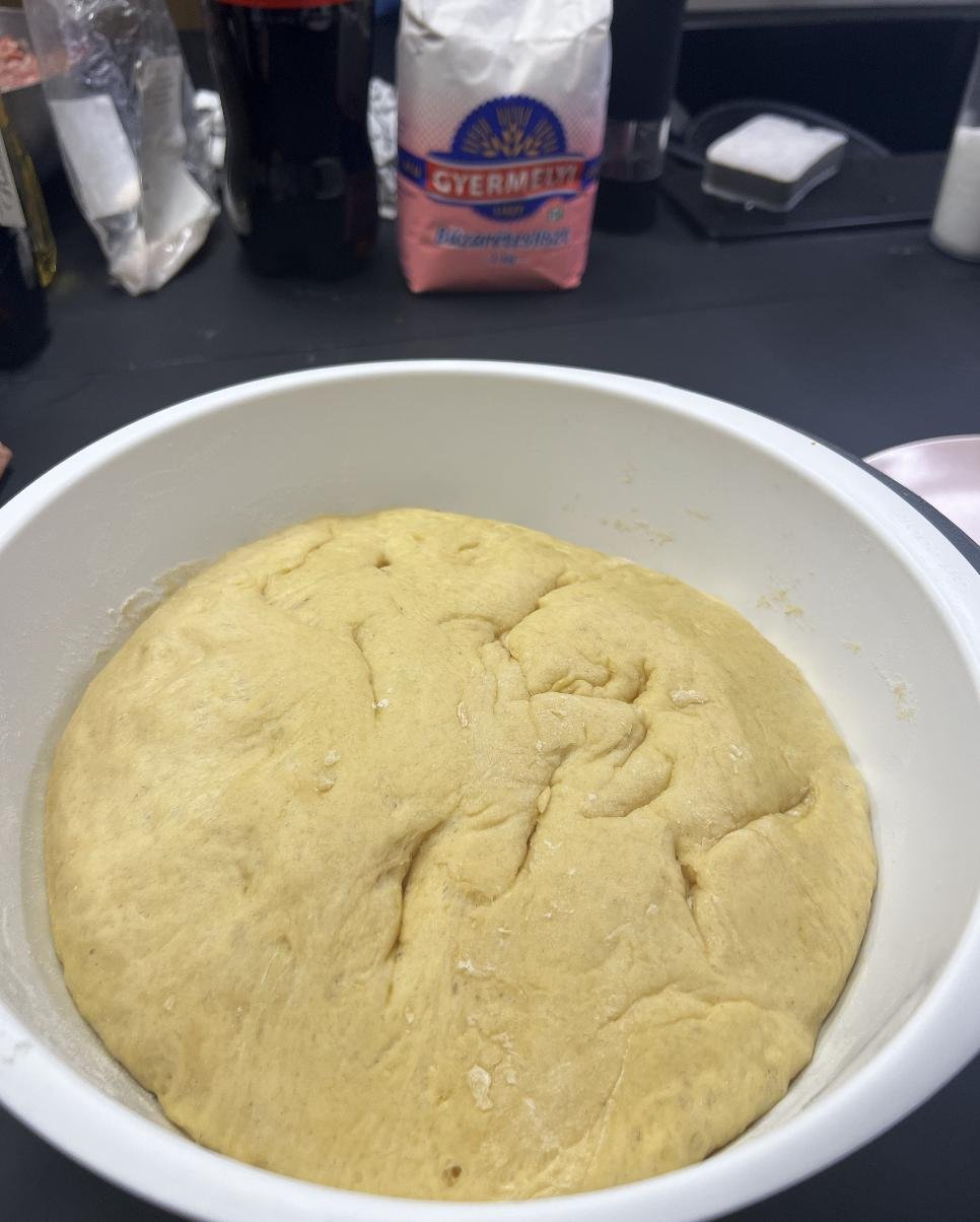 Сначала ставим опару: в теплое молоко добавляем сахар, дрожжи, размешиваем. В это время в большой миске смешиваем яйцо, соль, масло, и лучше б просеять муку (а можно и забить). Когда в опаре появятся пузыри, и она забродит, вылейте её в миску, перемешайте, и начинайте добавлять муку и перемешивать. Тут тесто должно быть помягче, приятное такое чтоб было. Замешали тесто, накрыли чем-нибудь и отставили. Можно отставить в теплое место, но не принципиально, тесто увеличится в 2-3 раза к моменту лепки.