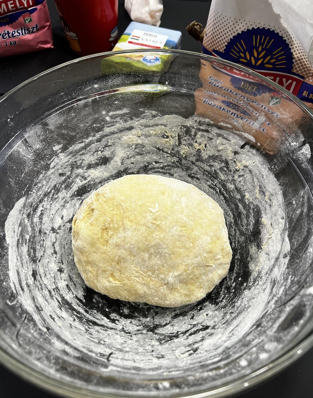 В миске смешиваем теплое молоко, яйцо, соль и сахар. Добавляем где-то полстакана муки, мешаем ещё до однородности. Ещё добавляем муки, замешиваем тесто, и ещё муки, в общем, вы поняли. Нужно замесить крутое тесто, как на пельмени.
