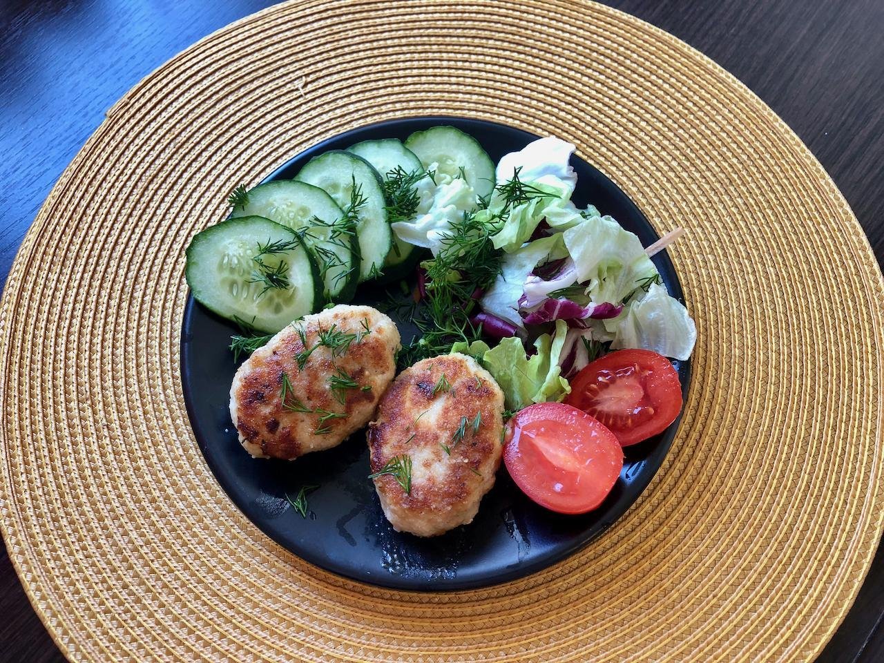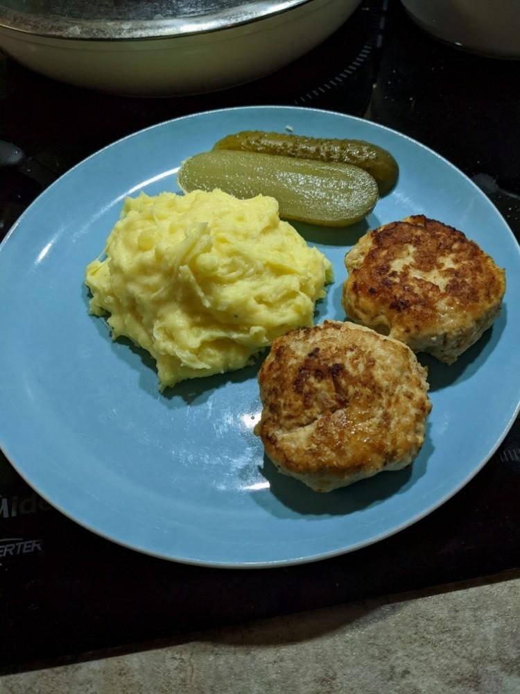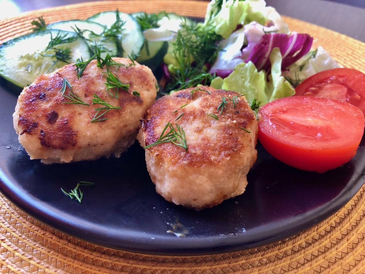 Что ж, готовим котлетосы из куриного фарша с жареным луком, дающего аромат, и сливочным маслом. Гарнир - по вкусу, и, кажется, что фаворитом будет картофельное пюре.