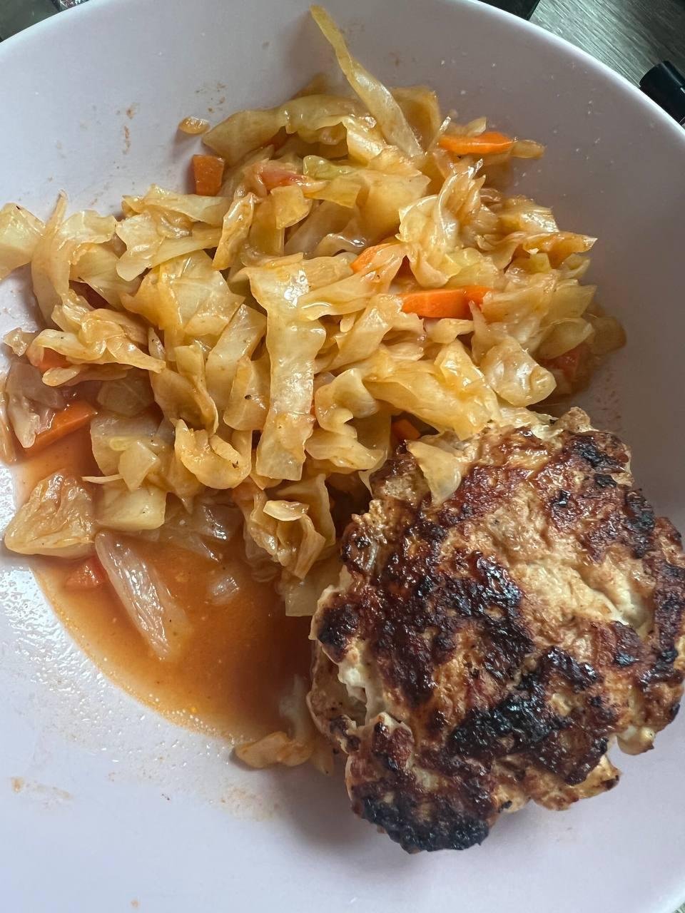 Две трети курица и лука взблендерила, а треть — мелко нарезала и лук оставила кусочками, текстуры для. Ну и капуста тушеная на гарнир.