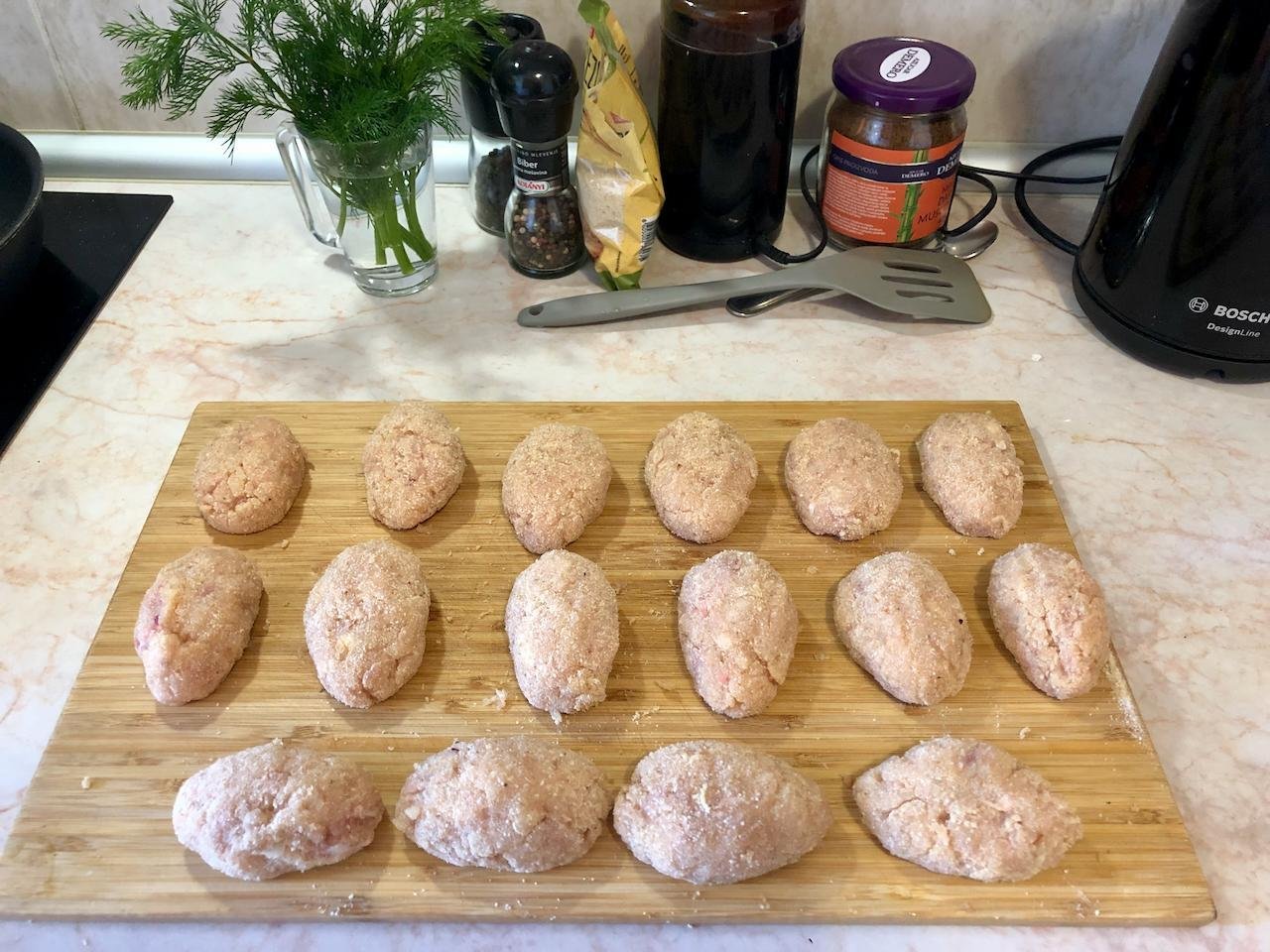 - Ставим миску с теплой водичкой, смачиваем руки и периодически тоже, когда начинаем чувствовать, что прилипает фарш к рукам. Формируем шарик из фарша и расплющиваем его. В этот раз порция сырой котлеты - около 68-70 грамм на одну, можно лепить и поменьше. Когда делаю часть под заморозку, лично мне удобнее накатать в шарики и приплюснуть уже перед жаркой. Получилось 14 котлет. Если хочется панировочные сухари - соответственно обвалять в них.
