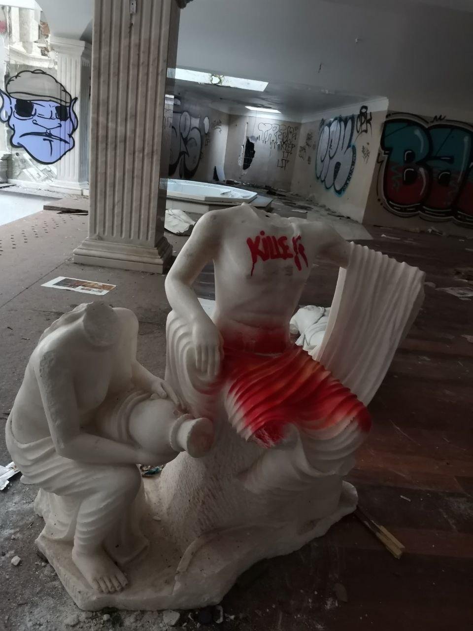 Разрисованные стены, разбитые стёкла и зеркала, поломанные статуи и мебель – все эти картины разрушений вызвали во мне вселенскую печаль. Это не то разрушение, ведущее к созиданию чего-то нового, а тупое людское кощунство. Мне даже стало горько оттого, как люди обошлись с этим поместьем. Ведь здания не виноваты в том, что их создатели обанкротились. Они как брошенные дети, с которыми внезапно случились 90е в 2020х. И 90е для них ещё не закончились.