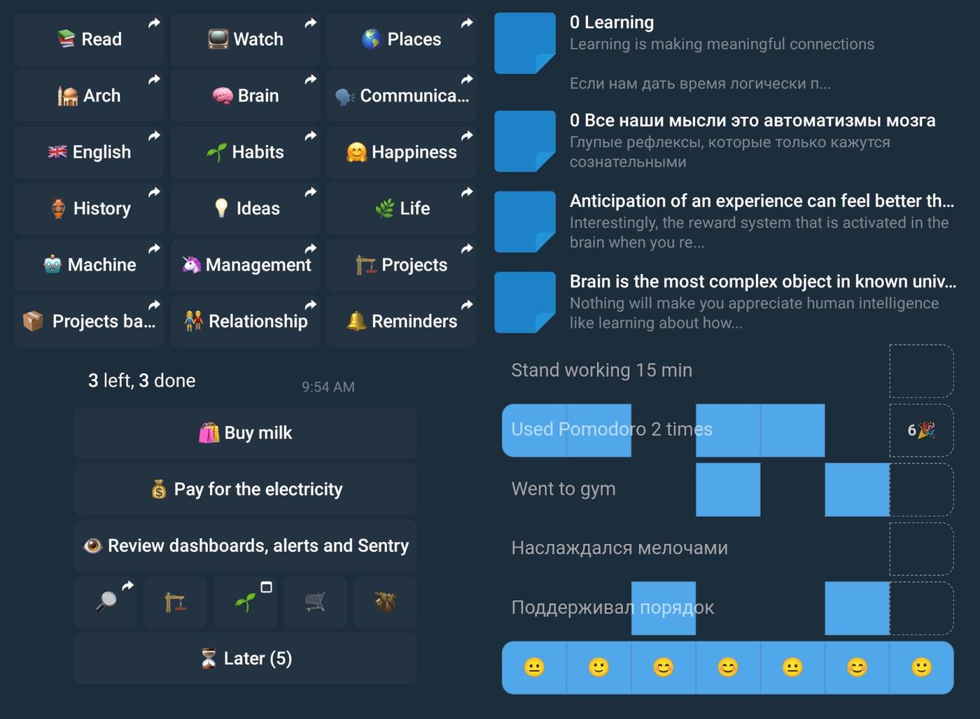По такому принципу построен весь бот - он не про цели и достигаторство. Он про то, как с минимальными усилиями повысить качество жизни: меньше стрессовать, меньше забывать, не продалбливать действительно важные дела, заниматься какой-никакой рефлексией...