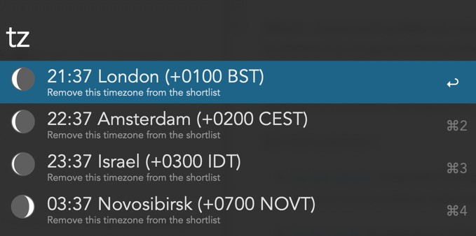 - Timezones: показывает текущее время в разных городах. По-дефолту вызывается по шорткату "clocks", изменил его на "tz":