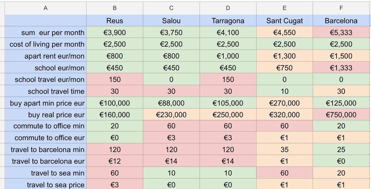 Для выбора конкретного города сделали таблицу/тепловую карту потенциально интересных городов. Планировали пойти в приватную школу: 450+150, когда детальней копнули то оказалось 650+170+160(автобус, обеды) и еще 3000 матрикула(вступительный взнос) за каждого ребенка. Забегая вперед пошли в публичную школу без таких затрат.