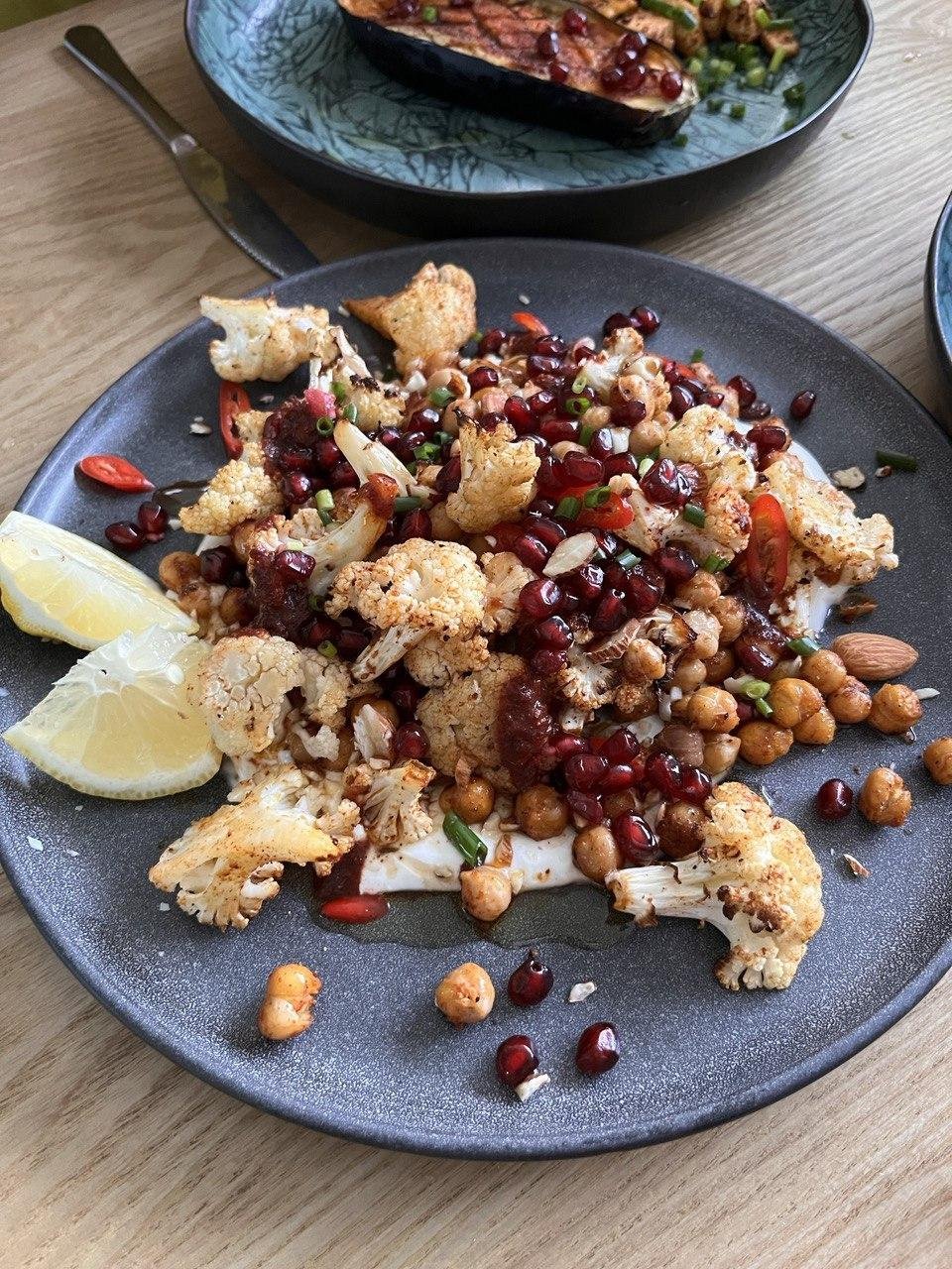 Набросайте на противень: цветную капусту, морковь, картошку, грибы, перец. Полейте оливковым маслом и посыпьте любимыми специями запеките при 200 С. 20 мин и вкуснейший гарнир готов. Очень здорово работают запеченные бобы, типа нута из банки. Бросите его в трэй к тыкве/цветной капусте.