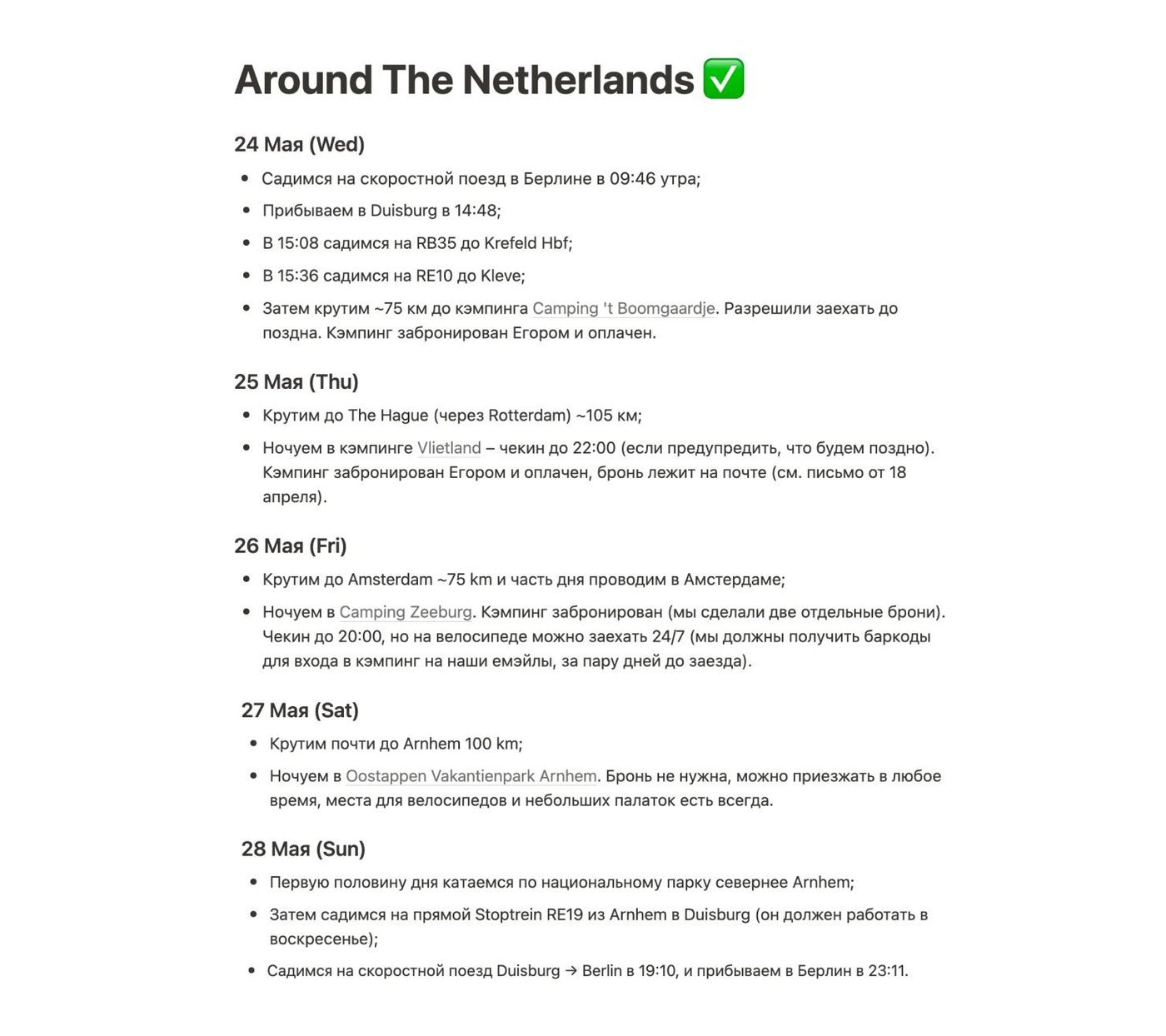 Для каждого велопутешествия заводим отдельный документ, в который записываем важные детали. Например, так выглядит результат планирования поездки по Нидерландам: