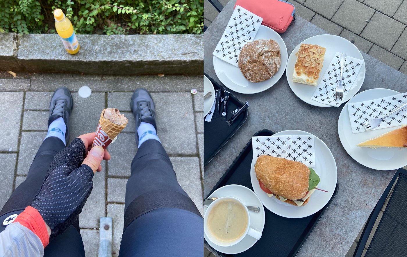 В каждую поездку кладу 5-6 энергетических батончиков, и уже по пути пополняю запасы всем, что попадется под руку. Небольшие привалы в течение дня классно устраивать в кафе или у магазинов, лопать мороженое или десерты, и двигать дальше.