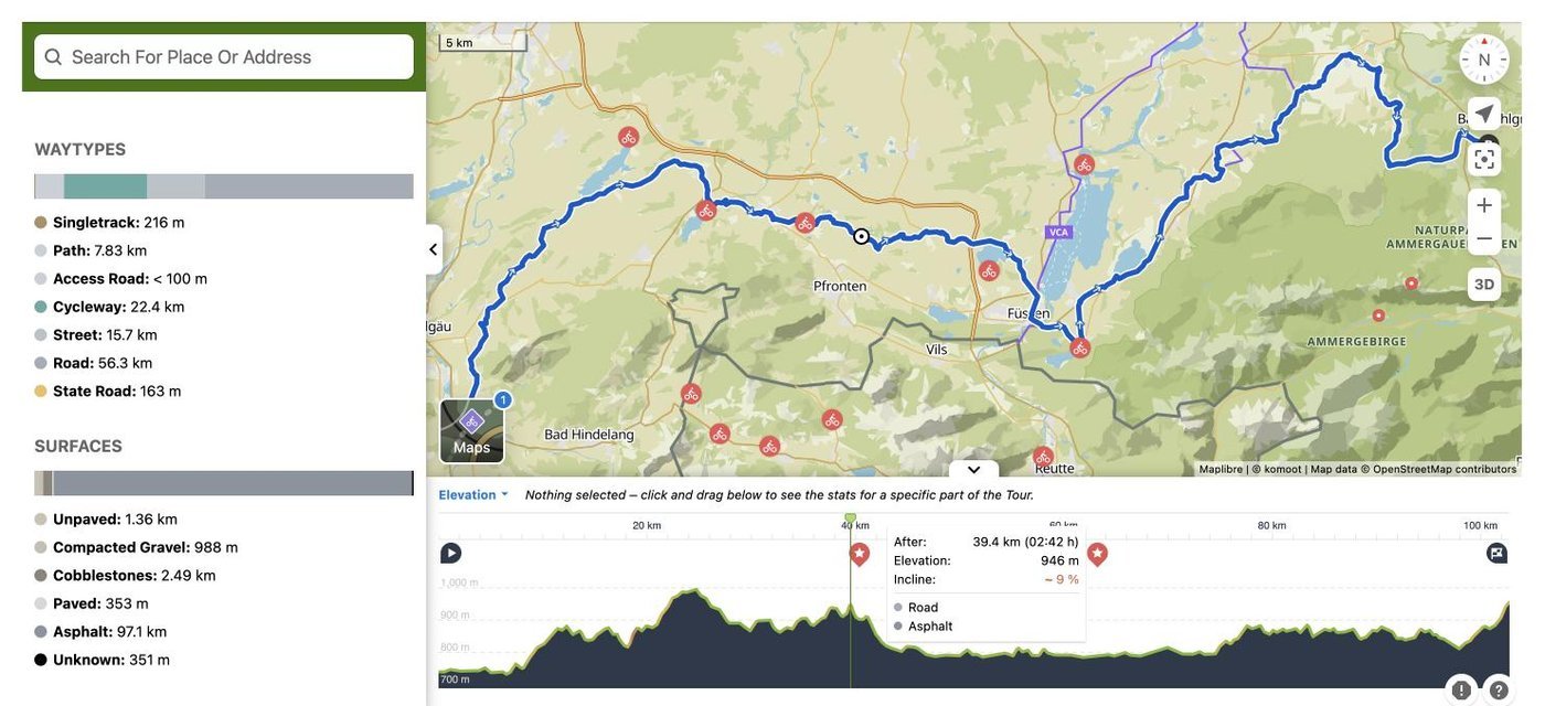 Прелесть Komoot'а в том, что он показывает по какому покрытию придется ехать, и какого количества подъемов и спусков ожидать: