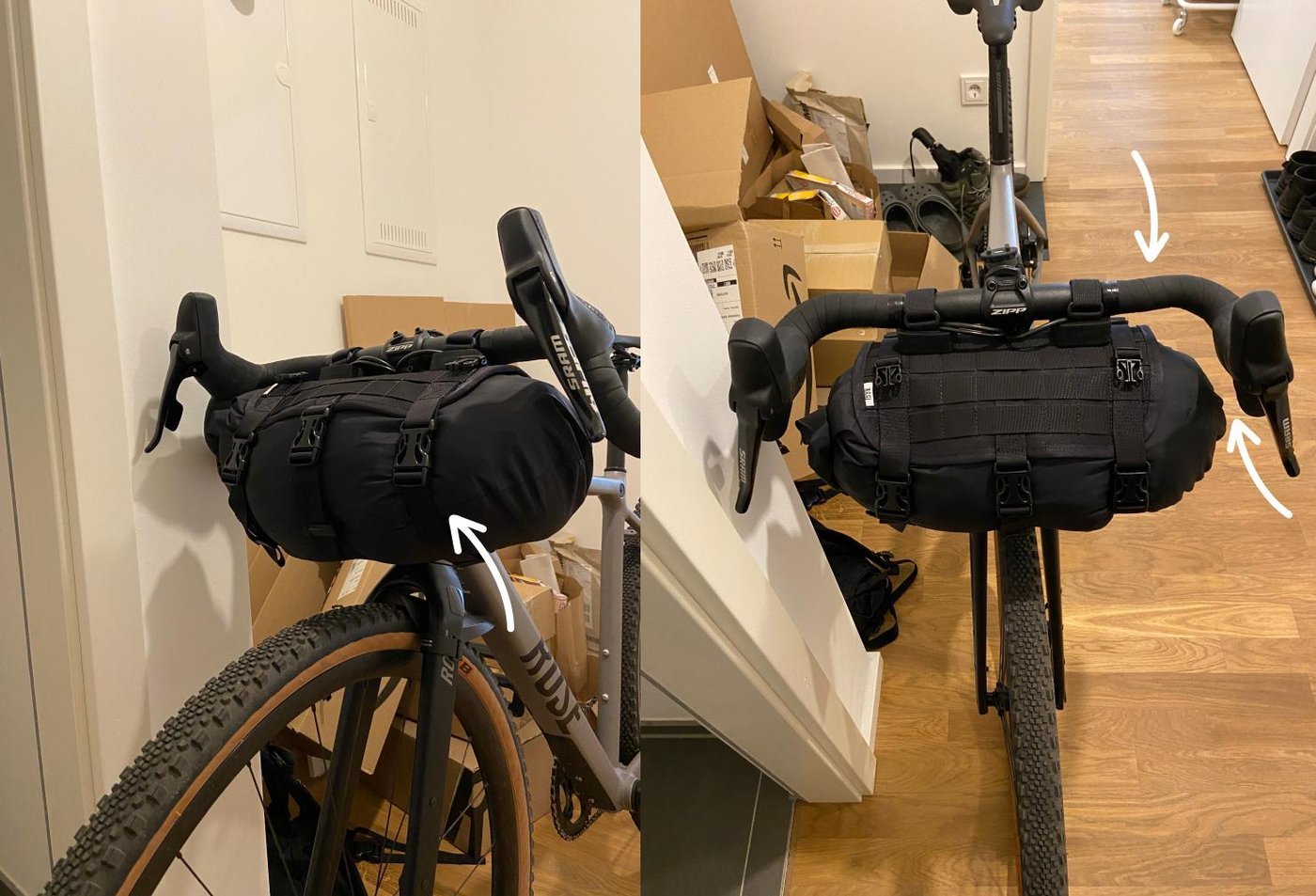 Место спереди руля - единственное место, куда могли поместиться палатка с ковриком для сна. Поэтому вместо классической сумки с отделениями и карманами, я купил "чехол" с Etsy, в который идеально влез водонепроницаемый мешок на 8 литров от Restrap.