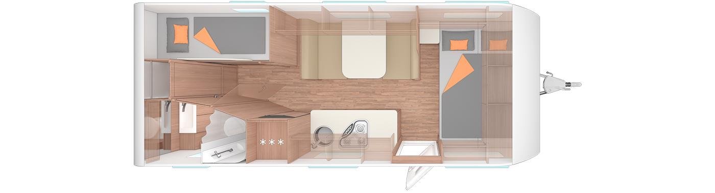 Этот прицеп относительно короткий - 6 м и узкий - 2,2 м. Днем можно сидеть всей семьей за столом, а ночью переделать для ребенка сидячую группу в кровать. Есть отдельная (родительская) кровать. Но для ребенка нужно каждое утро и каждый вечер раскладывать/убирать постель.
