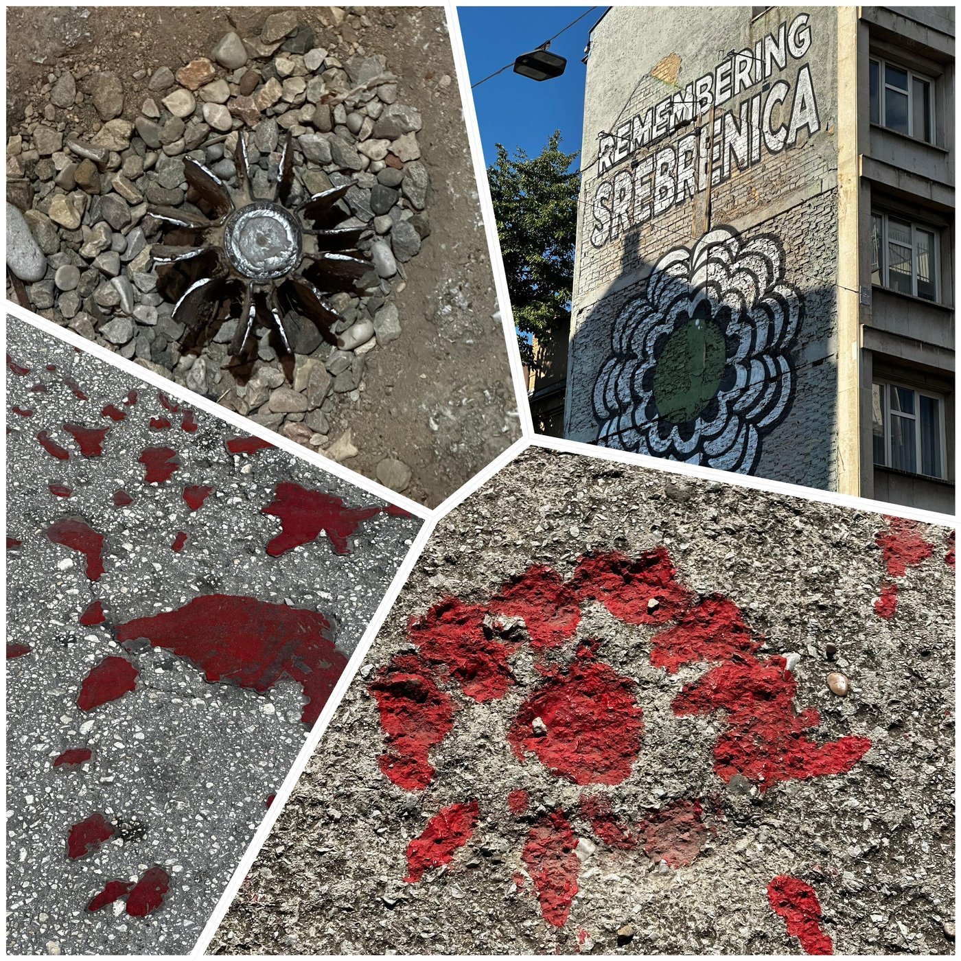 Дополняя эти «естественные» напоминания, по всему городу разбросаны оригинальные и вызывающие не менее сильные эмоции мемориальные инсталляции: кровавые следы в местах взрывов, снаряды в асфальте и граффити в память о кошмарной резне в Сребренице — крупнейшем акте геноцида со времён холокоста.