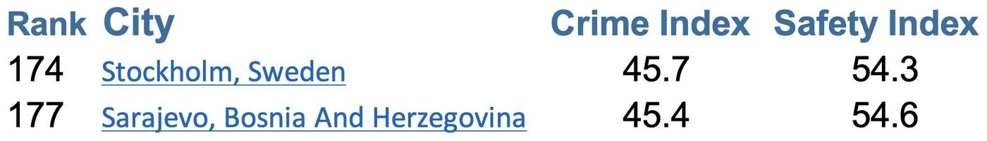 И завершу описание текущего положения дел в городе прелюбопытнейшей статистикой от Numbeo, согласно которой Сараево — внезапно — считается даже более безопасным городом, чем Стокгольм, например, что меня, мягко говоря, слегка удивило.