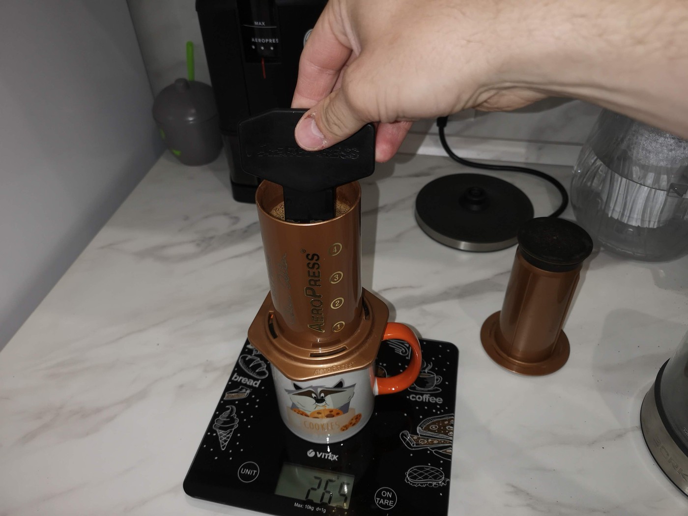 Ставим аэропресс на чашку и засыпаем кофе. Водружаем всю конструкцию на весы и заливаем 300г воды. Затем берем лопатку и перемешиваем содержимое.