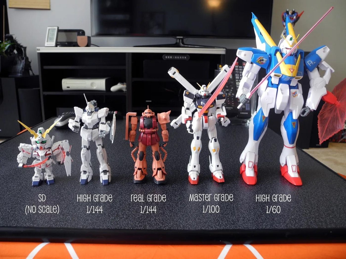 Изначально Gundam'ы были вдохновлены силовой броней из Звездного Десанта, и должны были не более 3-х метров в высоту, но тогда фигурки получались очень маленькими, и при производстве сериала размер Гандамов увеличили где то до 18 метров (я не понимаю почему нельзя было просто делать игрушки в других масштабах, но это Япония, там много странного). Сейчас Gunpla модели выпускают по сути в трех масштабах (если опустить всякие chibi варианты), это 1:144, 1:100 и 1:60. Модели выпускаются в различных сериях, и в отличие от вполне предполагаемого деления по сериалам, основное деление проходит по масштабу/детализации.