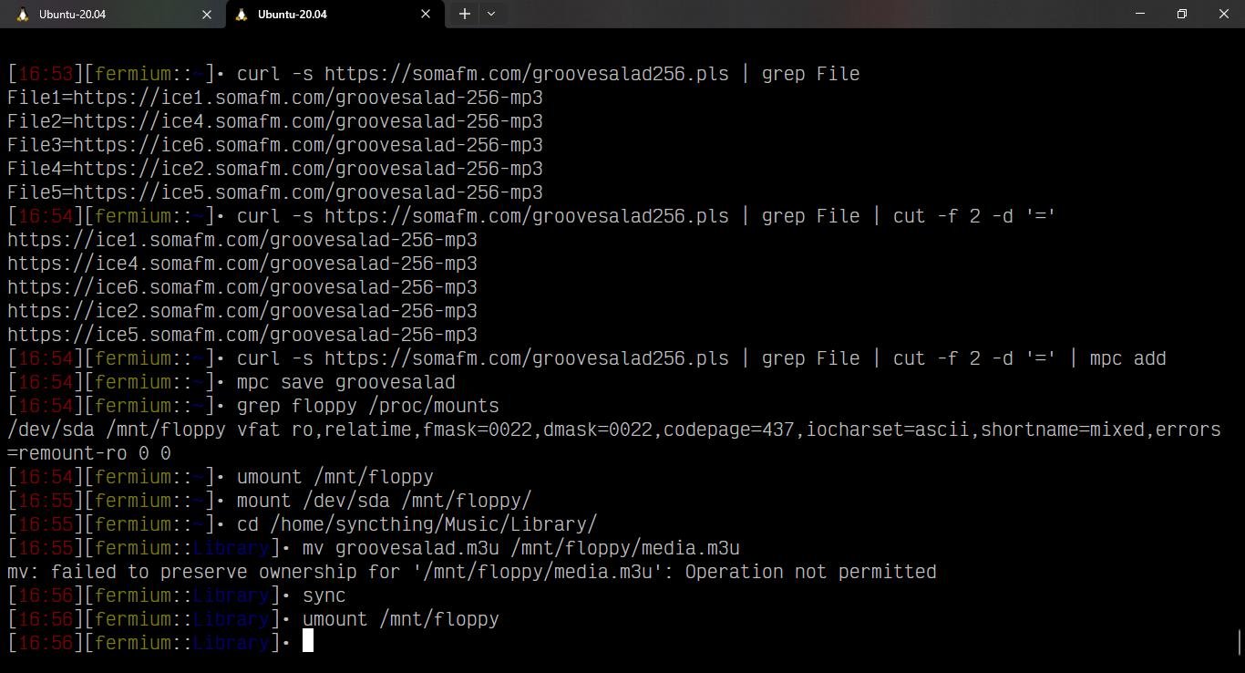 Дискета вставлена, можно монтировать и записывать плейлист. MPD нативно поддерживает формат M3U, поэтому его и будем использовать. Мой скрипт после автоматического монтирования ищет файл /mnt/floppy/media.m3u, туда мы и сохраним результат. Рекомендую записывать путь к файлам относительно директории, в которой определена библиотека MPD, так они будут портативными. Ровно те же файлы плейлистов у меня используются в проигрывателе Vanilla Music на телефоне. Весь процесс записи плейлиста есть на скриншоте.