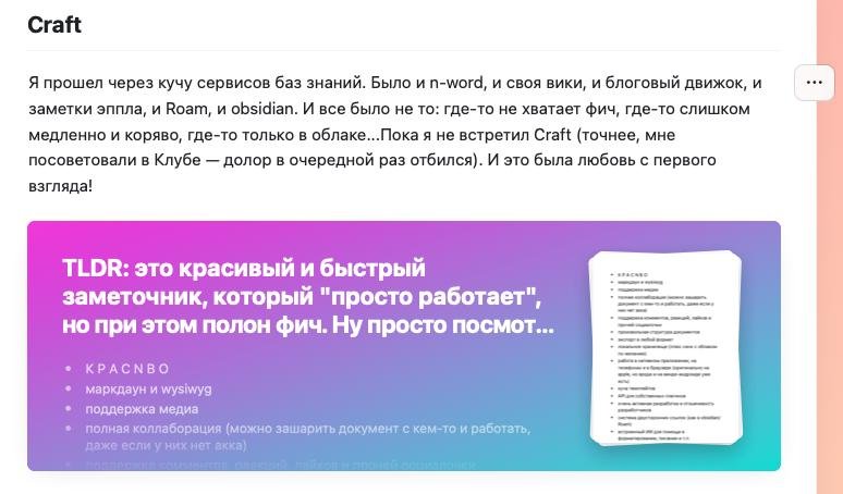 Я прошел через кучу сервисов баз знаний. Было и n-word, и своя вики, и блоговый движок, и заметки эппла, и Roam, и obsidian. И все было не то: где-то не хватает фич, где-то слишком медленно и коряво, где-то только в облаке...Пока я не встретил Craft (точнее, мне посоветовали в Клубе — долор в очередной раз отбился). И это была любовь с первого взгляда!
