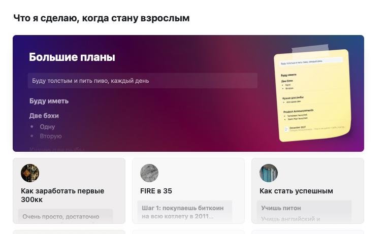 Это очень удобно: всю важную инфу выносишь на "главную", а любые дополнительные данные: ссылки, размышления, детали можно унести в дополнительную страницу. Так как каждый блок может содержать под-страницу, получается удобная структура. Естественно, внутри этой под-страницы по-прежнему можно использовать бэклинки и прочие прелести. Если хочется выделить эту часть, можно превратить блок в "карточку":