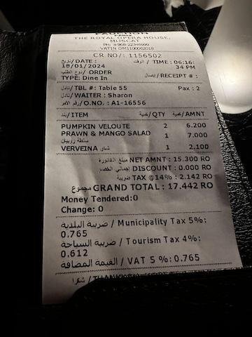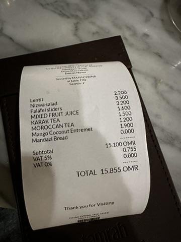 Ну и третья особенность призвана освежить ваши знания школьной математики, потому что в Омане VAT (НДС по-нашему) не включён в стоимость, а значит чтобы получить финальную сумму, ко всем ценам надо прибавлять налог. Хорошо хотя бы, что он составляет всего 5%, потому что для подсчёта менее круглой цифры на ходу пришлось бы задействовать куда больше извилин (и то не факт, что их бы хватило).