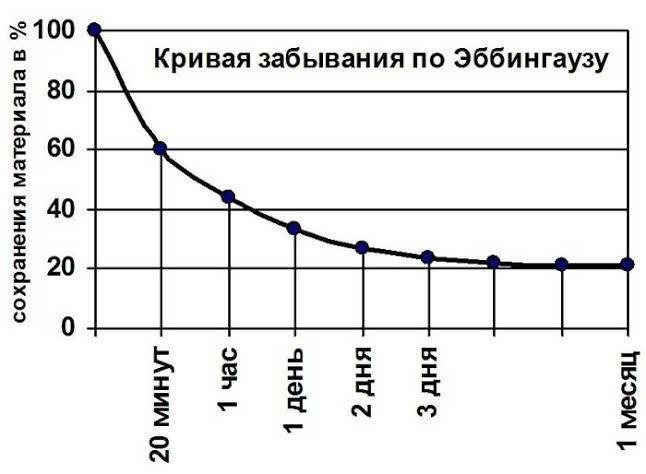 Она показывает, что из 100% усвоенного в понедельник к среде у вас в голове останется только 20%. То есть из 120ти учебных минут помнить вы будете только 24 минут.
