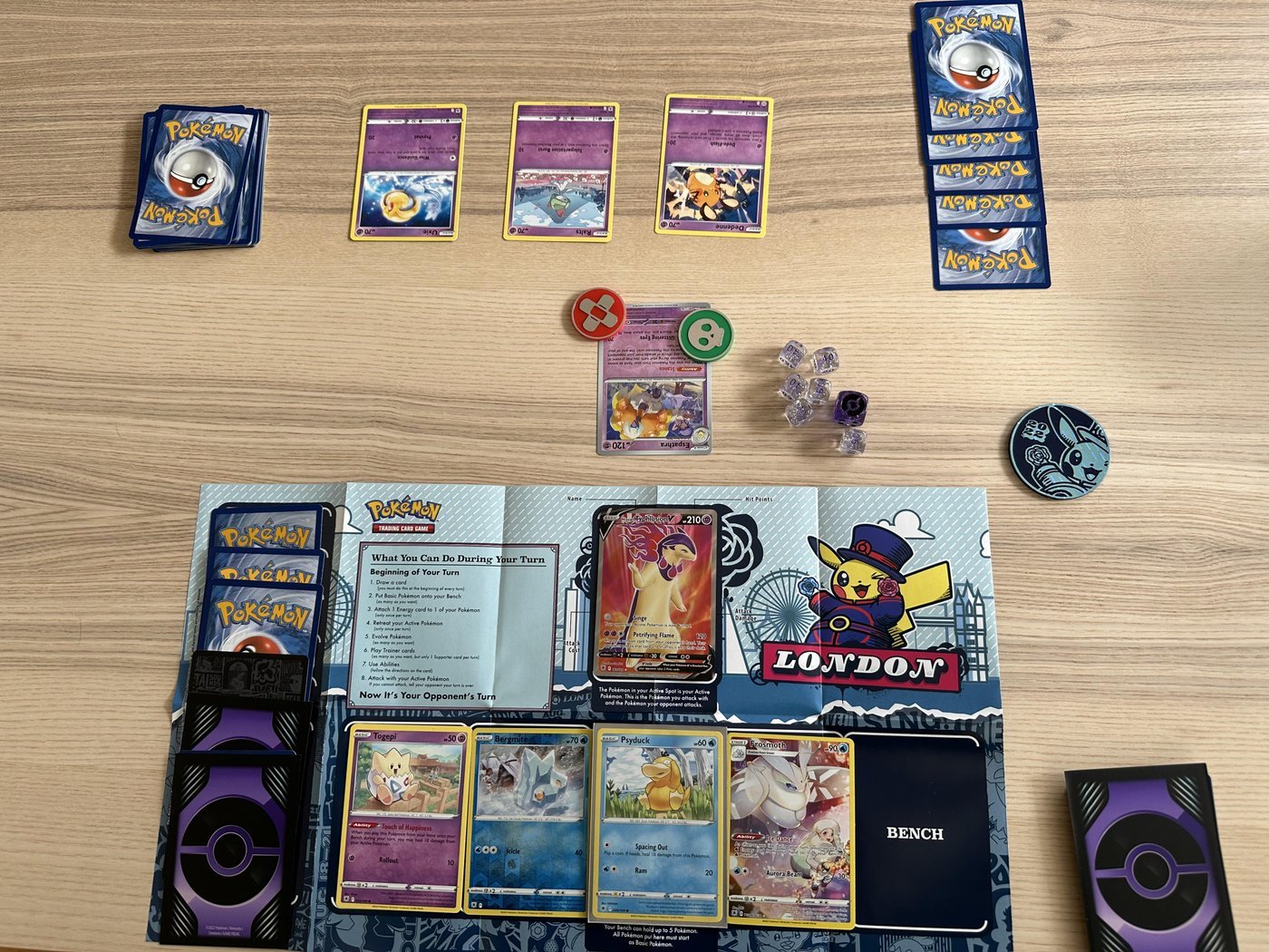 Сетап: Игра начинается с того, что каждый игрок выкладывает своего стартового Покемона на "скамейку", а также несколько Покемонов на скамейку запасных.