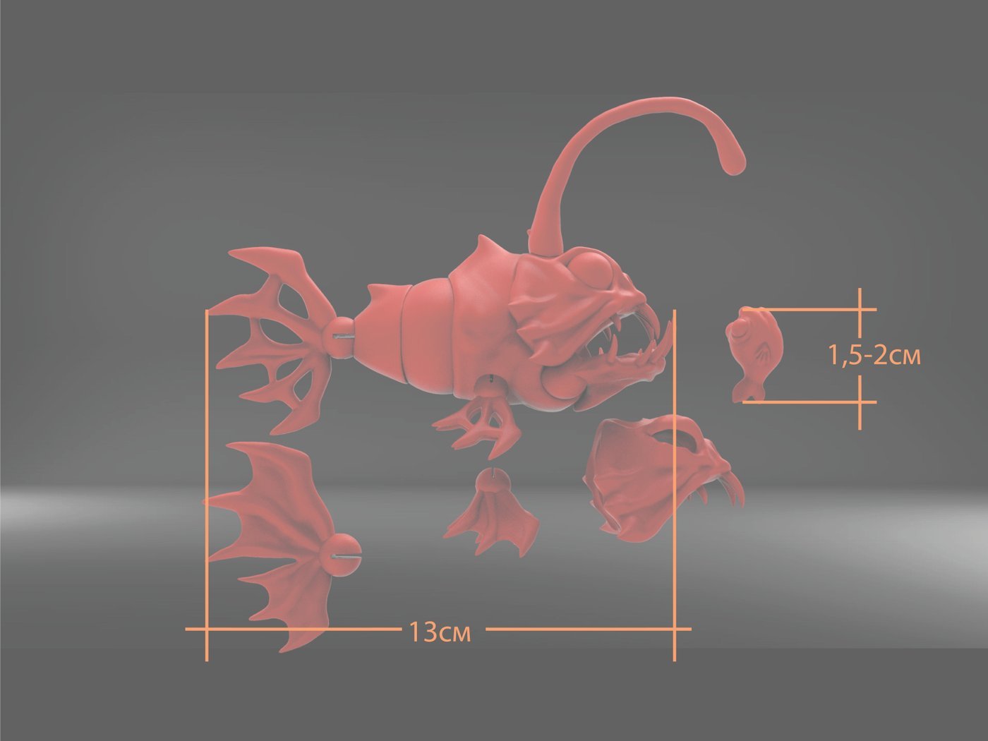 У данной модели два типа плавников: обычные и зомби версия😁 А еще две морды: открытые глаза, "дремлющее зло". Подвижная челюсть на неодимовых магнитах. И сменный плавник, который превращает, превращааает морского черта в…пусть будет пиранью.