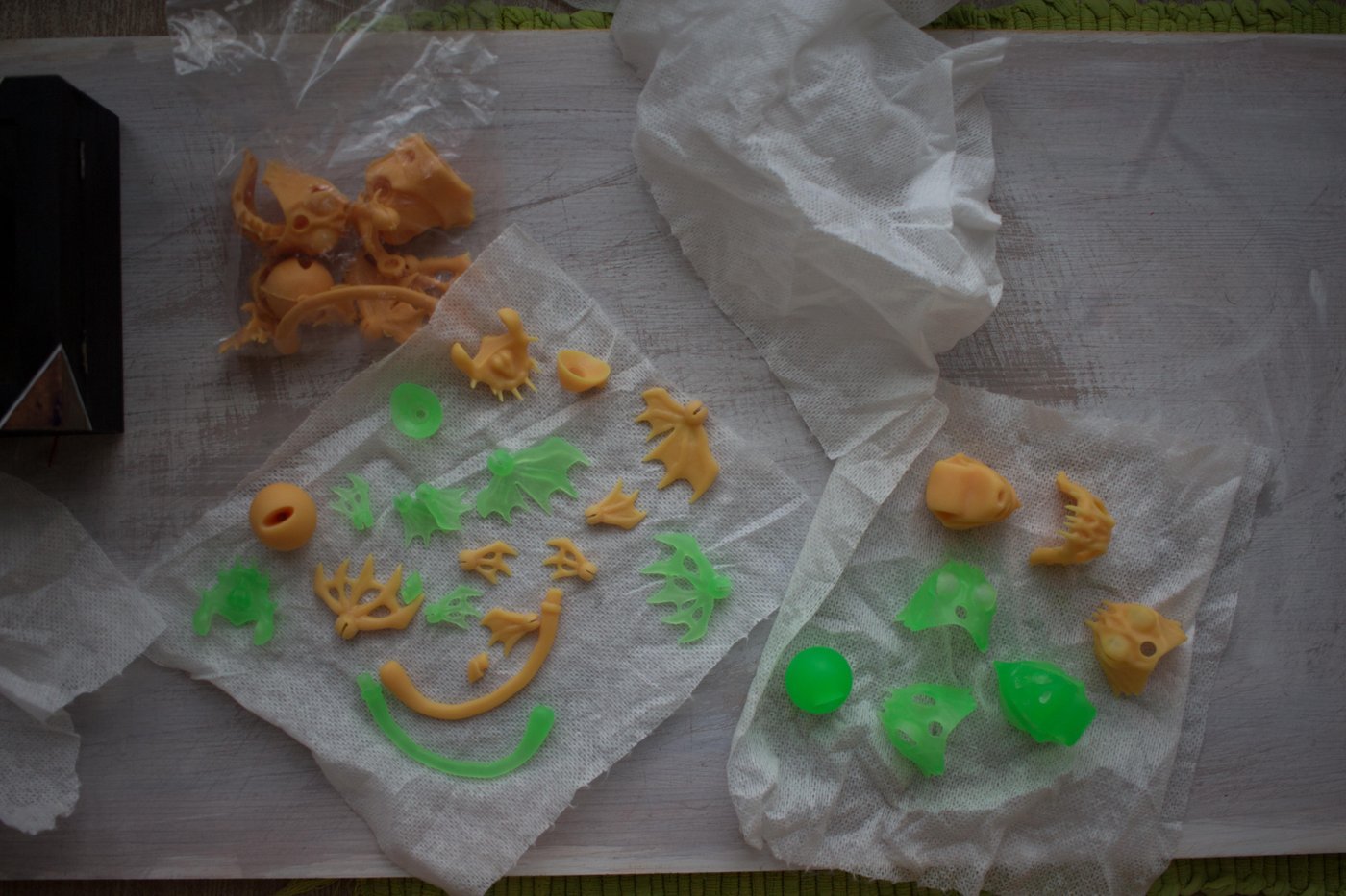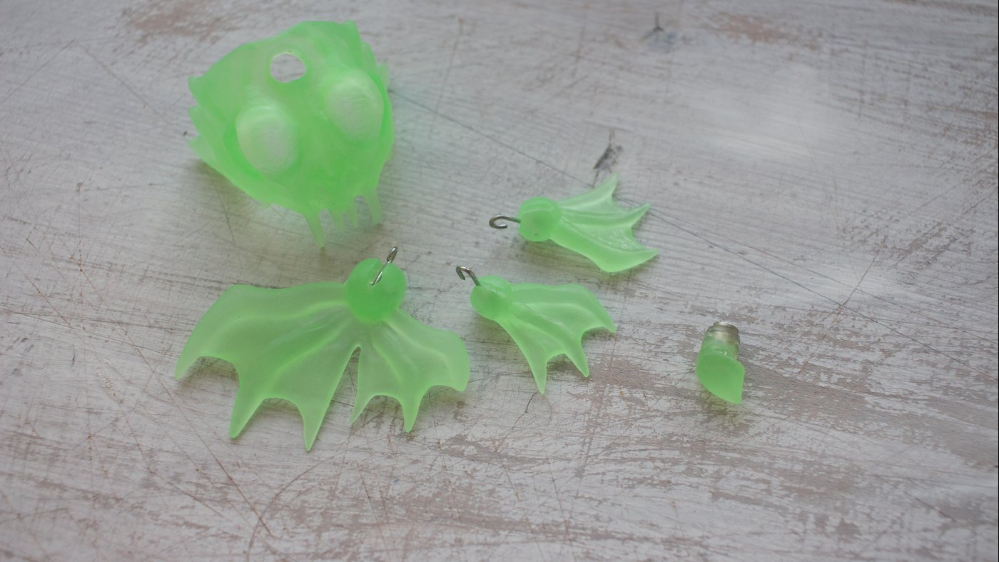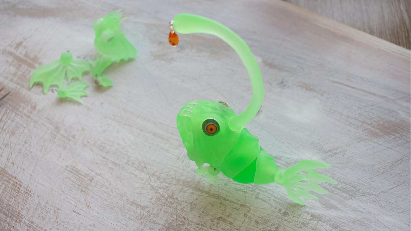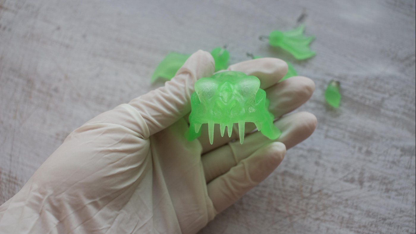 Да, можно было бы просто купить люминофор в порошке, развести с лаком и на этом все. Но мне нужен был именно светящийся целиком материал. Хотелось на выходе получить «существо» полупрозрачное, яркое и светящееся в темноте.