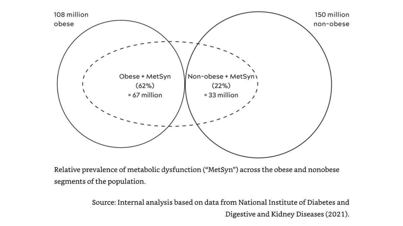 На картинке ниже можно заметить, что из 100 млн американцев с диагнозом метаболического синдрома практически треть не имеют ожирения.