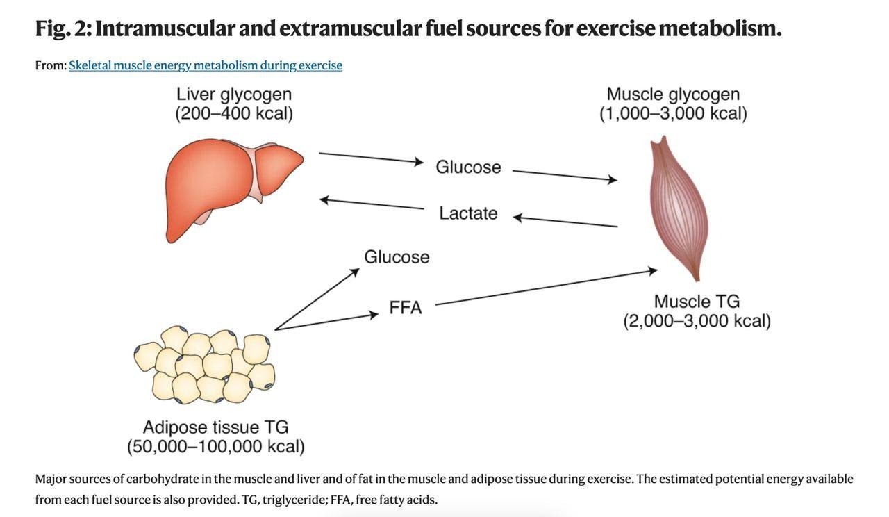 Допустим, вы здоровый индивид и съели пончик 🍩. У углеводов из этого пончика две потенциальные судьбы. Для начала, углеводы превращаются в гликоген - форму хранения глюкозы. Далее, часть этого гликогена прямиком отправляется в мышцы, а остальное - про запас, в печень. Итого: мышцы и печень - первая судьба наших калорий из пончика. Взрослый мужчина, например, может единовременно хранить гликогена (в мышцах и печени) на около 2000 калорий. Этой энергии достаточно примерно на 2 часа очень интенсивной тренировки.