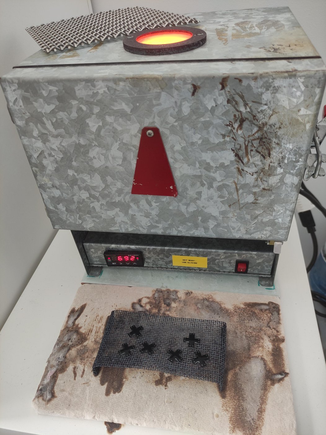 Следующим номером нашей программы идут эмалевые кресты. Горячая эмаль - это по сути толчёное цветное стекло. Стеклянный порошок наносят сухим или мокрым способом, а потом запекают в печке при температуре около 700 градусов. Я предпочитаю мокрое нанесение, чтобы лёгкие не напоминали шахтёрские после 20 лет рудников. Сначала медные заготовки надо отжечь в печи при рабочей температуре, отбелить кислотой для удаления окислов, промыть раствором соды, обработать латунной щеткой для окончательной очистки поверхности и положить в спирт или ацетон, чтобы обезжирились и не окислялись. Только после этого кисточкой нежно наносим эмалевую суспензию, и это чисто ручная операция, которую ни ускорить, ни автоматизировать нельзя.