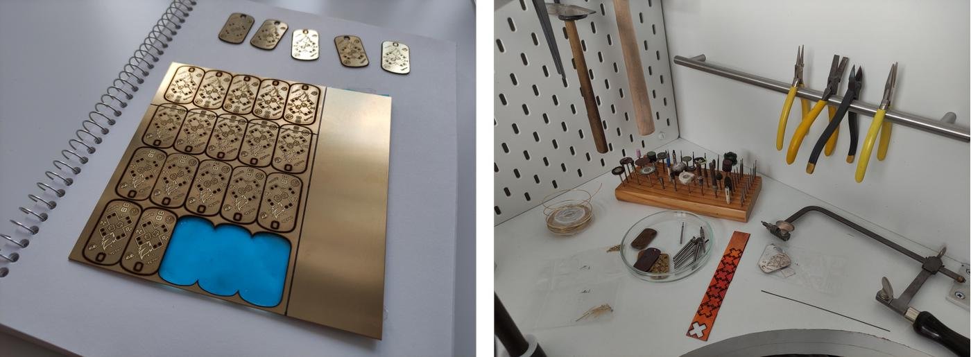 Файлы для гравировки и лазерной резки я готовила в Rhinoceros, но в принципе для этого подходит любая программа, позволяющая экспортировать кривые в формате dxf. С настройками машины пришлось помучиться: латунь и серебро вели себя хорошо, а вот медь оказалась довольно зловредной и самой энергоёмкой, но после нескольких неудачных подходов с ней тоже удалось справиться.