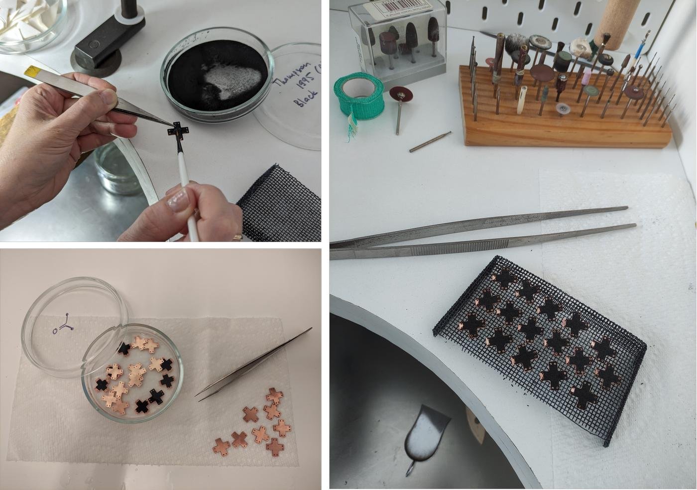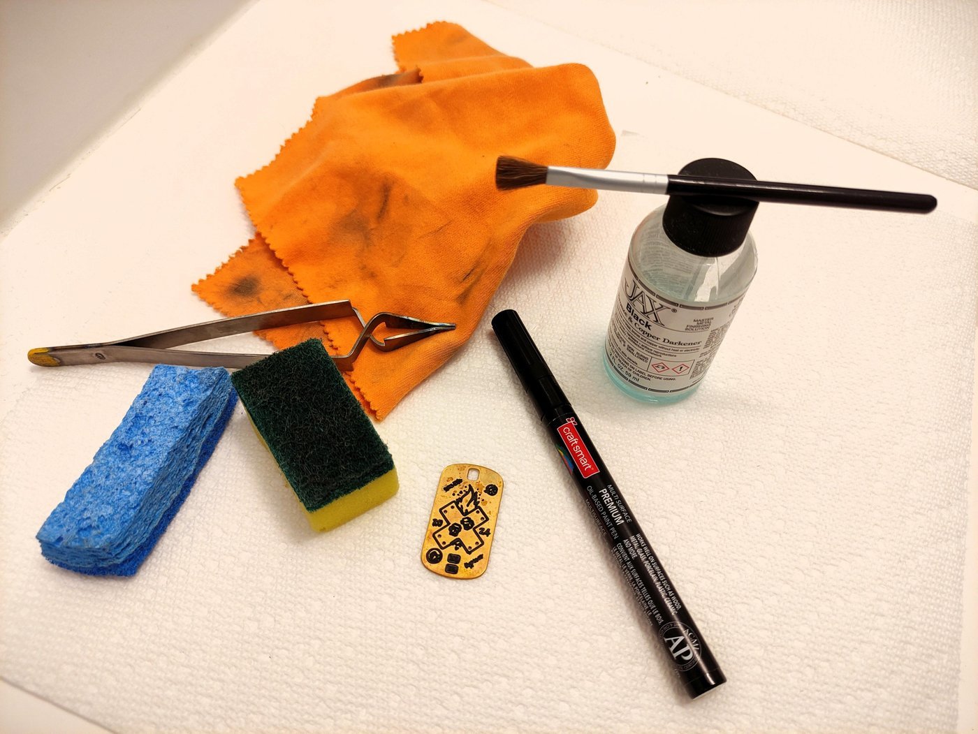 Следующий этап - патинирование и нанесение текстуры. Латунь, не будучи благородным металлом, легко окисляется на воздухе: покрывается пятнами и темнеет. Отменить этот процесс невозможно, поэтому я решила его возглавить и окислить металл принудительно. Текстурирование же понадобилось, во-первых, для придания жетонам более брутального вида, а во-вторых, из соображений, что царапины всё равно неизбежно появятся со временем, поэтому лучше, если они будут восприниматься не как баг, а как фича. После серии проб и ошибок была выявлена оптимальная последовательность действий: покрасить гравировку маркером -> дать высохнуть -> оттереть поверхность губкой ScotchBrite, которая одновременно и наносит нужную текстуру -> вымыть проточной водой -> окунуть в раствор окислителя -> сполоснуть -> ещё раз оттереть более нежной губкой, чтобы придать патине однородность. Я не очень довольна раствором для патинирования - так и не удалось подобрать такой режим и концентрацию, чтобы цвет получался одинаковым на всей партии жетонов. Конечно, в идеальном мире я бы поэкспериментировала подольше, но в реальности время поджимало. Примечательно, что на стадии общего планирования я этому покрасочному этапу вообще отвела очень мало времени и внимания, потому что всё же понятно. Ну не красила я раньше гравировку, ну не окисляла я латунь, а только серебро и другим раствором, но что тут вообще может пойти не так? Практика, как всегда, показала зубы и продемонстрировала, что даже простейшими на первый взгляд операциями нельзя пренебрегать, они отомстят. Например, маркер хорош только для гравировки тонкими линиями, с большими окрашенными участками я намучилась при оттирании излишков.