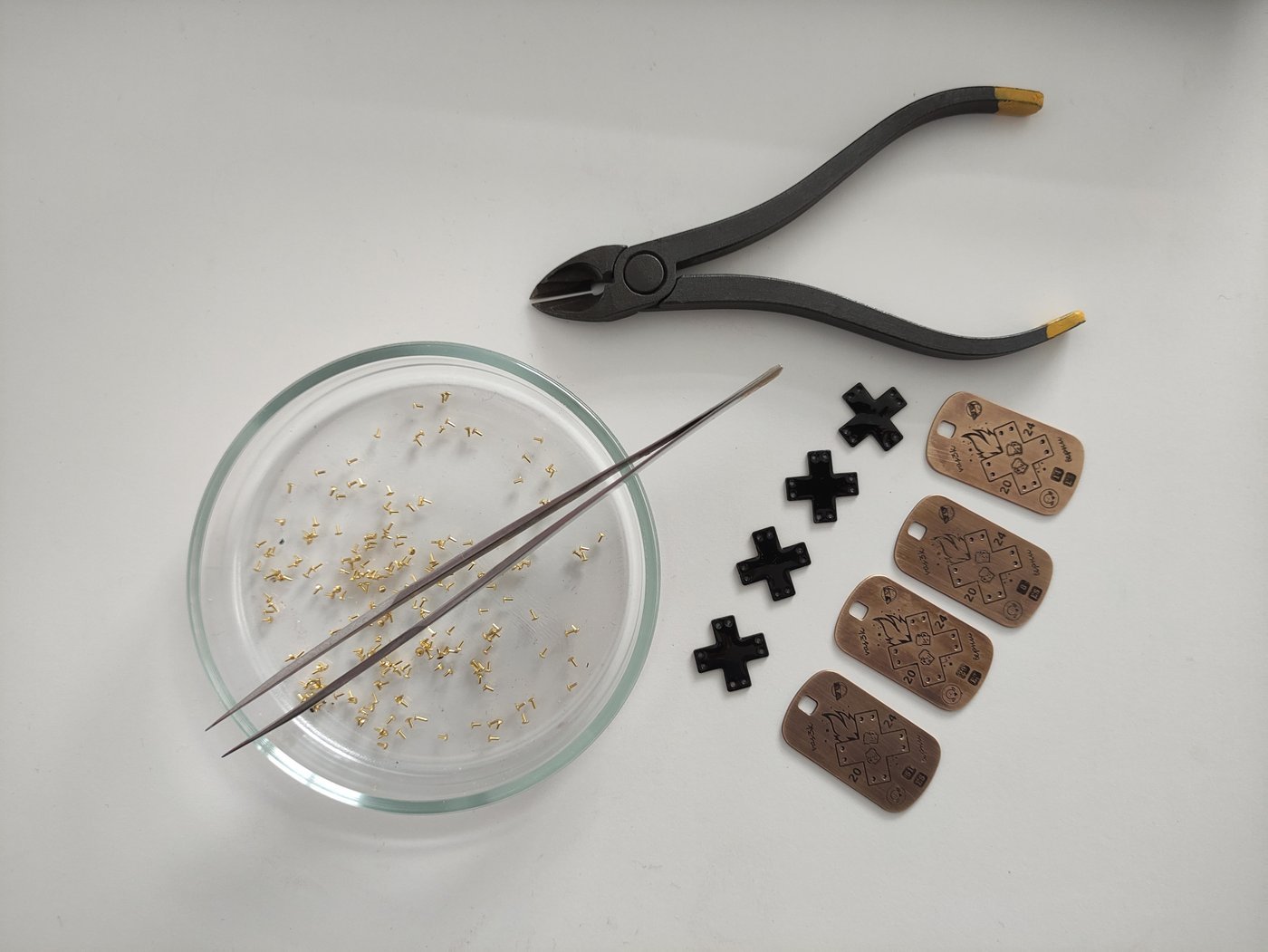 Крепко забуксовав на предыдущем этапе, сборку я начала поздно. Слишком поздно. Изначально я планировала крепить кресты к медальонам с помощью самодельных заклёпок из латунной проволоки. Я даже сделала пробный экземпляр, как умная. С пробником, как водится, всё вышло зашибись. Вот только воспроизводить этот прекрасный результат с нужной скоростью уже не получалось. Пришлось признать, что с запланированной технологией в сроки я не уложусь никак, поэтому срочно была рождена колхозная альтернатива. Вместо самостоятельного изготовления заклёпок был закуплен пакет латунных булавок в ближайшем магазине для крафтеров, а детали мы в итоге соединяли при помощи эпоксидки.