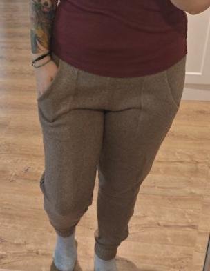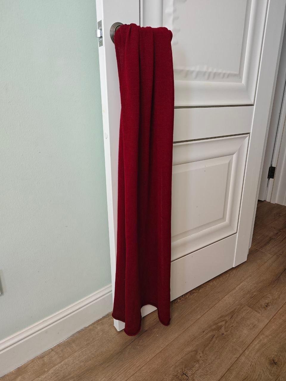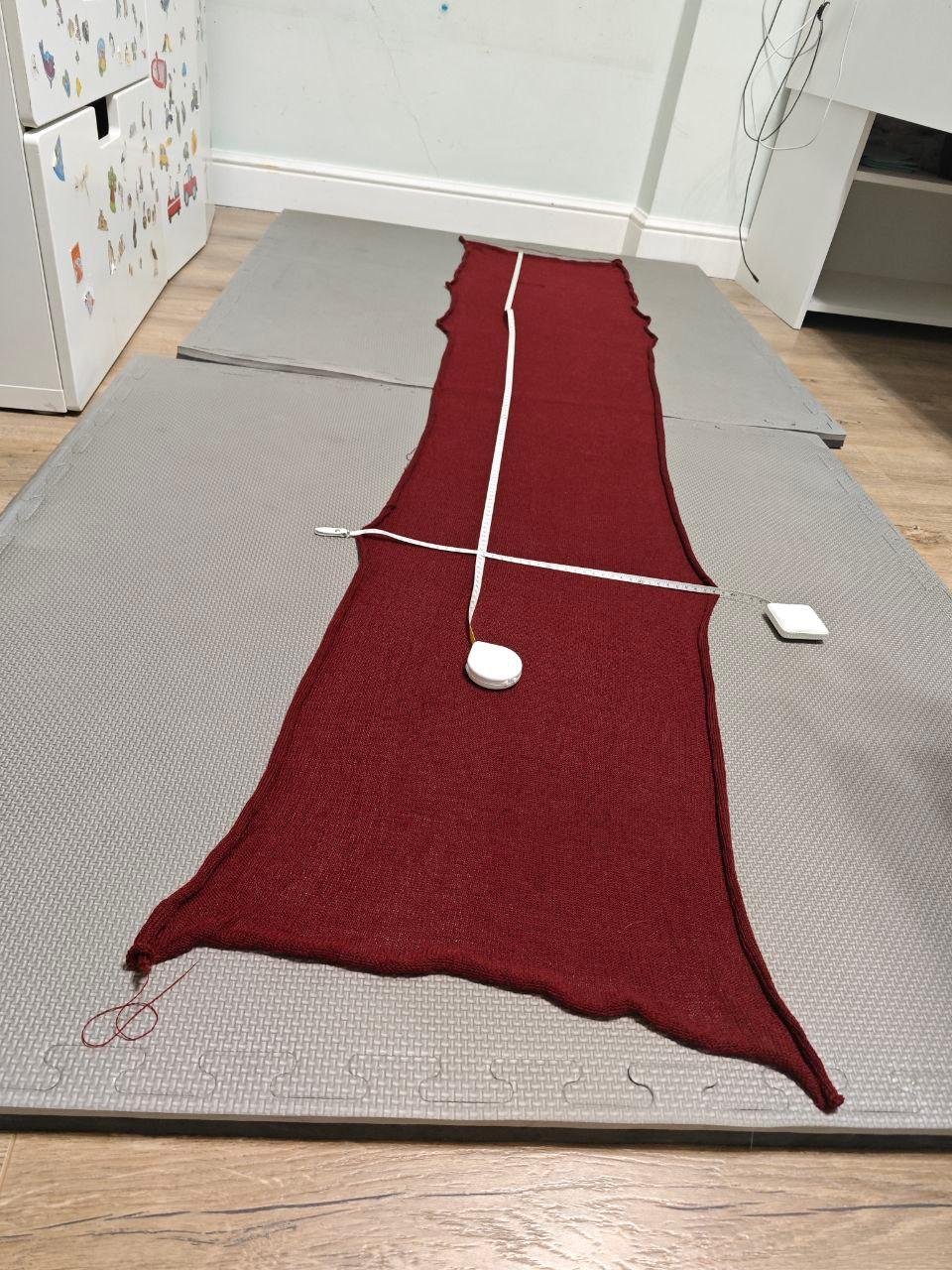 Так это выглядит. Правда, когда полотно довязывается до пола, и перестает оттягиваться, все равно приходится перевешивать грузики на изделие. Для этого есть более нежные крепежики и способы. Обычно такое не происходит со свитерами/шапками - только с длинными вещами типа штанов и шарфов.