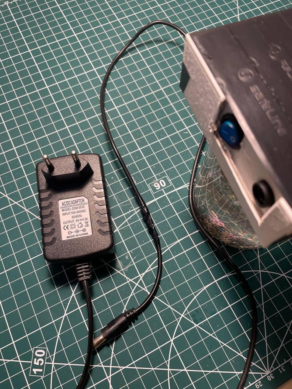 Питание сделал из старого адаптера для телефона (5V). Отрезал провод и припаял штекер от другой зарядки. Показалось, что так удобнее хранить шар, чтобы провод от него можно было отсоединить. Плюс изначально хотелось сделать переключатель 2-х режимов: от сети и от батареек.