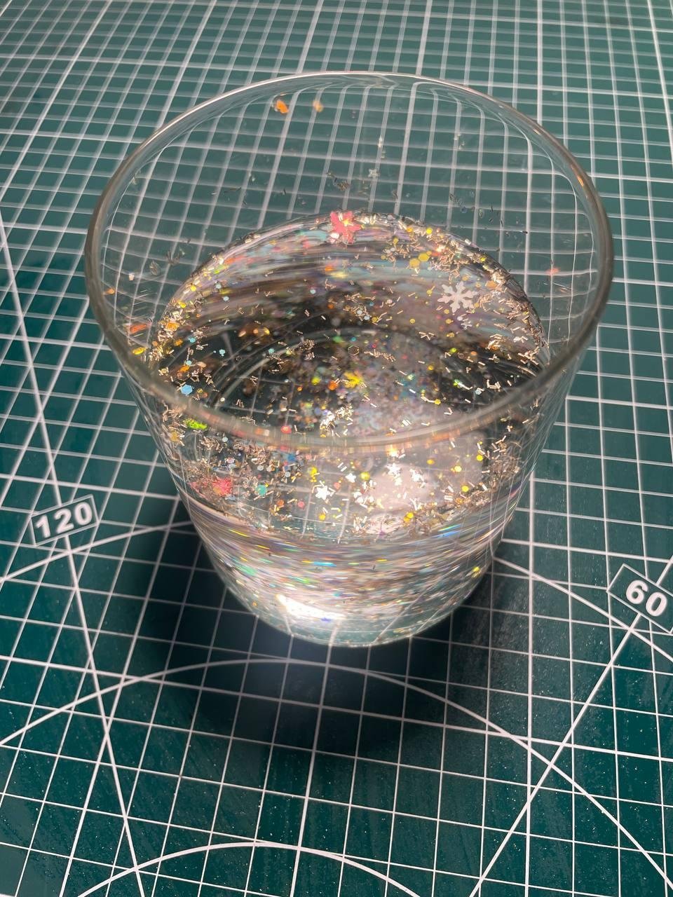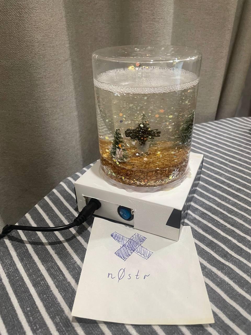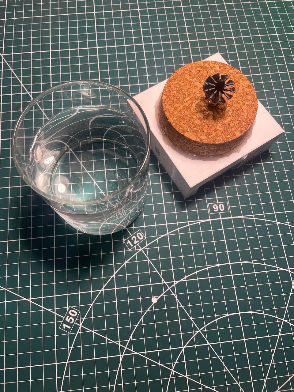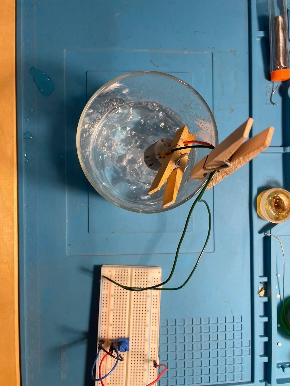 В процессе много экспериментировал со скоростью вращения. Резисторов подходящих не нашлось. Придумал решение с ограничением напряжения через потенциометр, который нашел в ардуино наборе. Но в итоге уже не успел и решил соединить напрямую (ожидаемо это привело к тому, что мотор крутится слишком быстро). Еще подбирал сочетание глицерина и воды, но в итоге разницы большой не было. Намешал где-то 1 к 3.