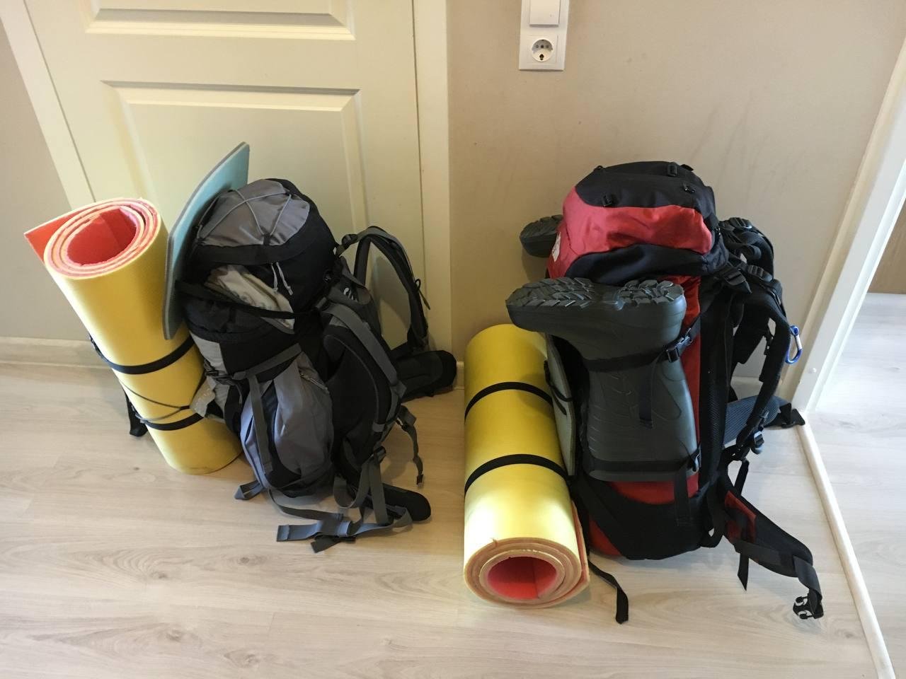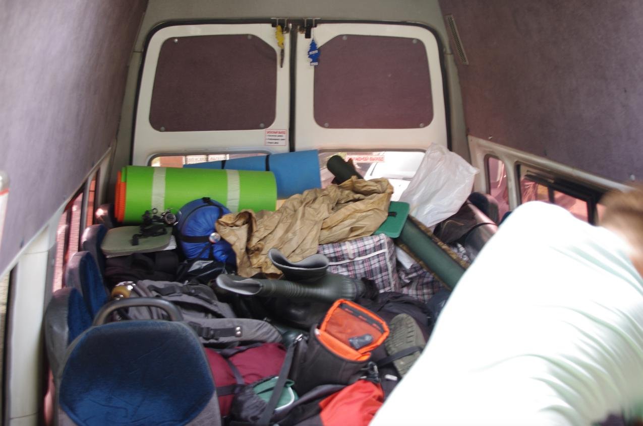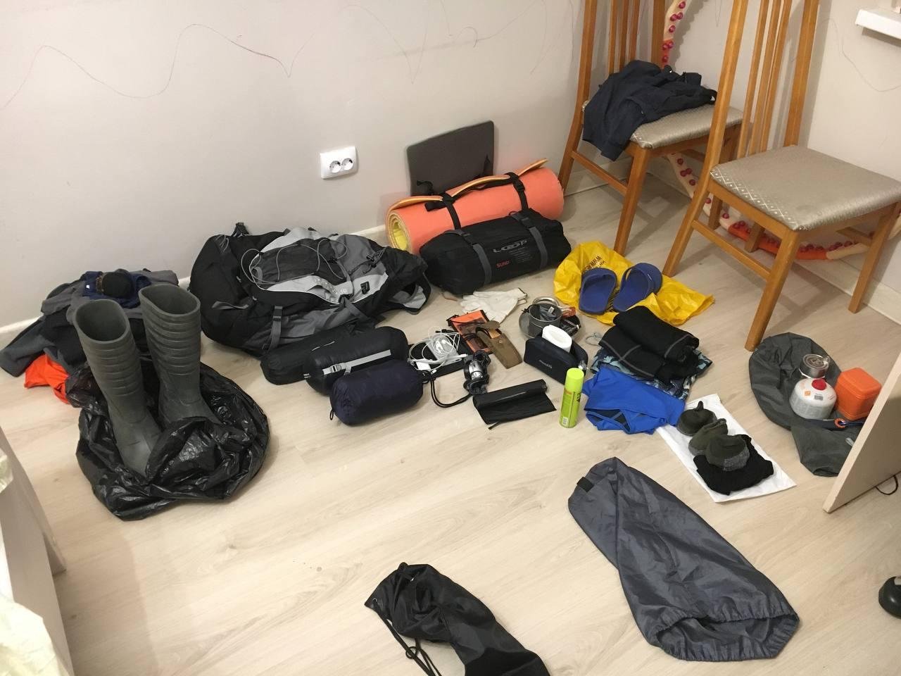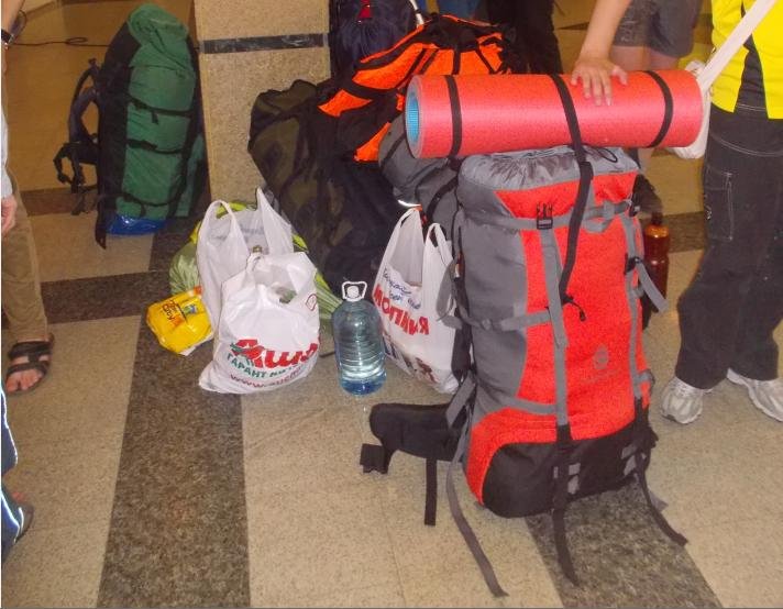Туристчиеской снаряги было ничего. Рюкзак(зеленый на фото), палатку взяли попользоваться. Купили только походные тарелки с ручкой, спас жилеты, вёсла, балоны для катамарана(раму на месте собирали из подручных средств). Рюкзак весил около 20кг, у него не было рамы и форма задавалась уложенное пенкой и сапогами.