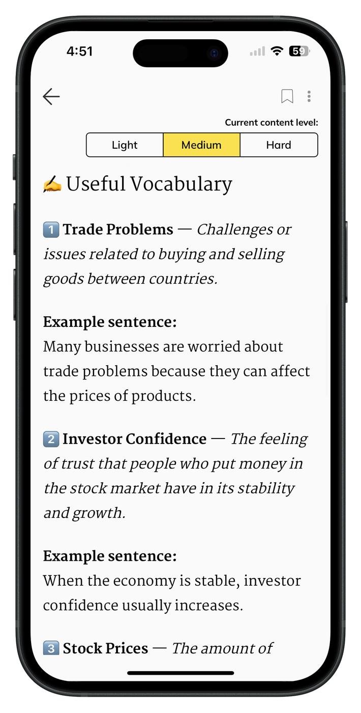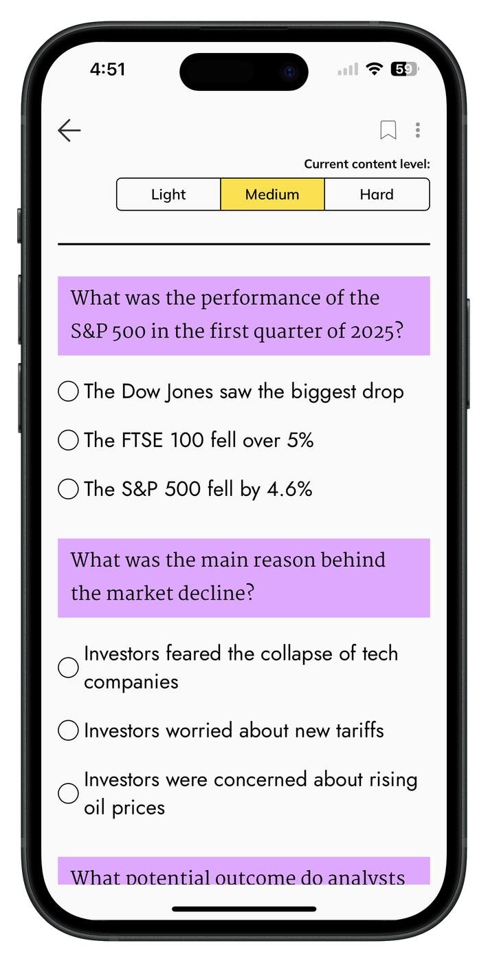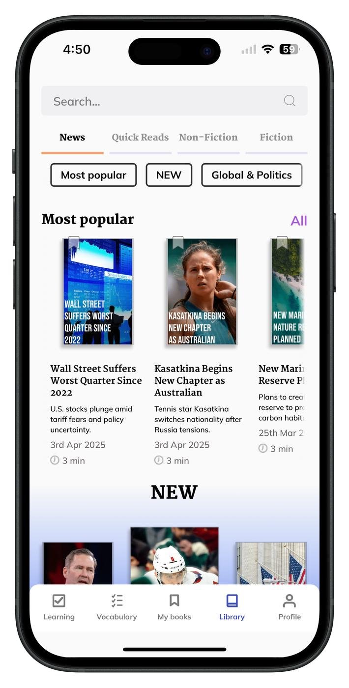 – Все материалы есть в трёх уровнях сложности: pre-intermediate, intermediate и advanced. Например, политику читаю на advanced, а финансы — на intermediate. Уровень можно менять в любой момент.