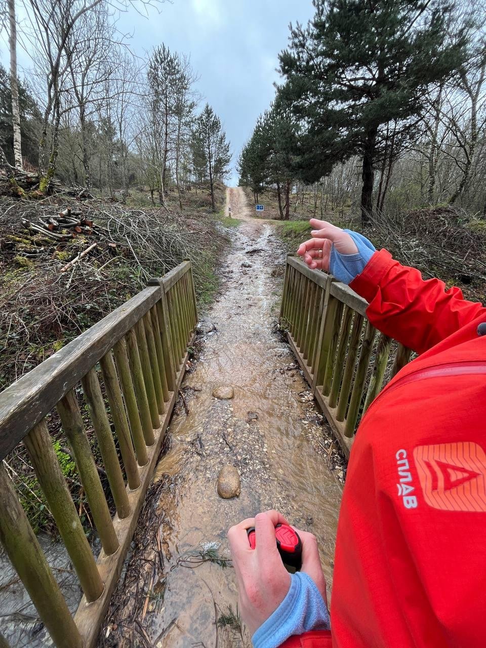 Дорога в целом простая, в лесу, но сразу 200м набора на 2км и все размыто. Шли бодро, но в 800м от барс услышали крик/визг, завывания ветра и через 1мин пришел порывистый ветер, град, ливень. Как итог обмерзшие руки(град прям резал, промокли)