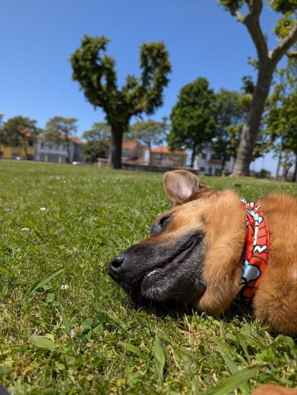 Чего он ещё не умел - это спать на улице. Я тренировала этот месяц навык расслабления на улице. Специально ходила с ним в парк с книгой или йогой, и подкрепляла любые признаки расслабления, но добились мы только того, что раз в полчаса голову мог на траву положить. Этот навык пригодился. В дни длинных переходов, в жару, когда я видела, что пес становится рассеянным, мы с ним ложились и дремали в обнимку в церковных дворах, там тихо, нет прохожих, трава мягкая и прохладно. Это существенно восстанавливало его силы и делало собраннее и спокойнее.